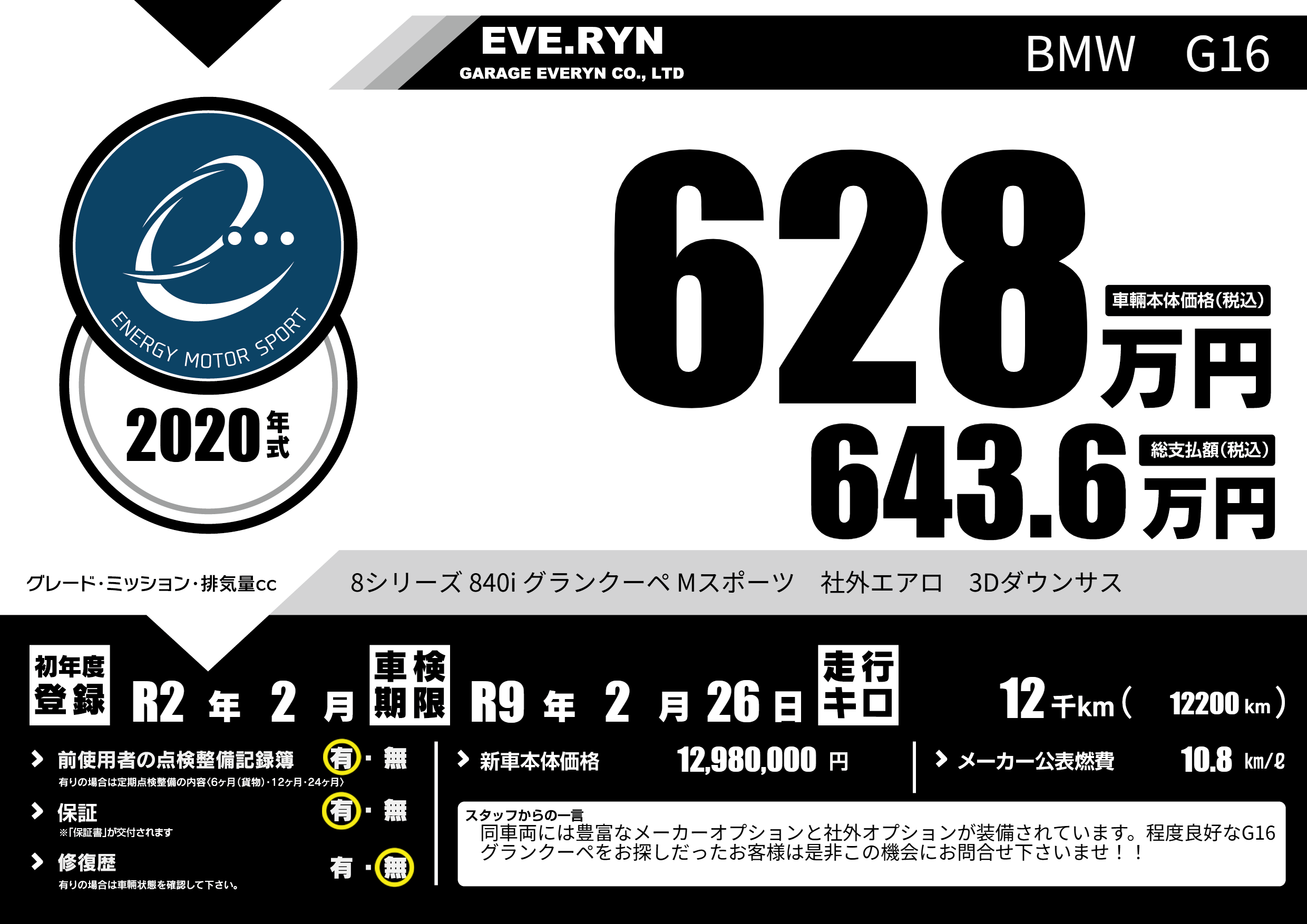 | 車名 | BMW G16 | グレード ミッション 排気量 |