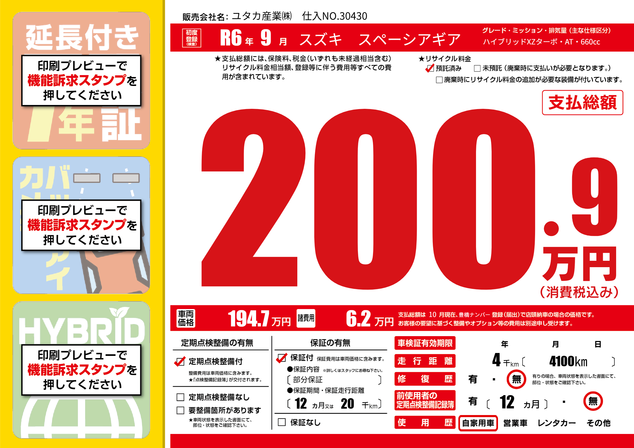 | 走行キロ | 0.4万km | 初年度登録 | R6年9月 |
