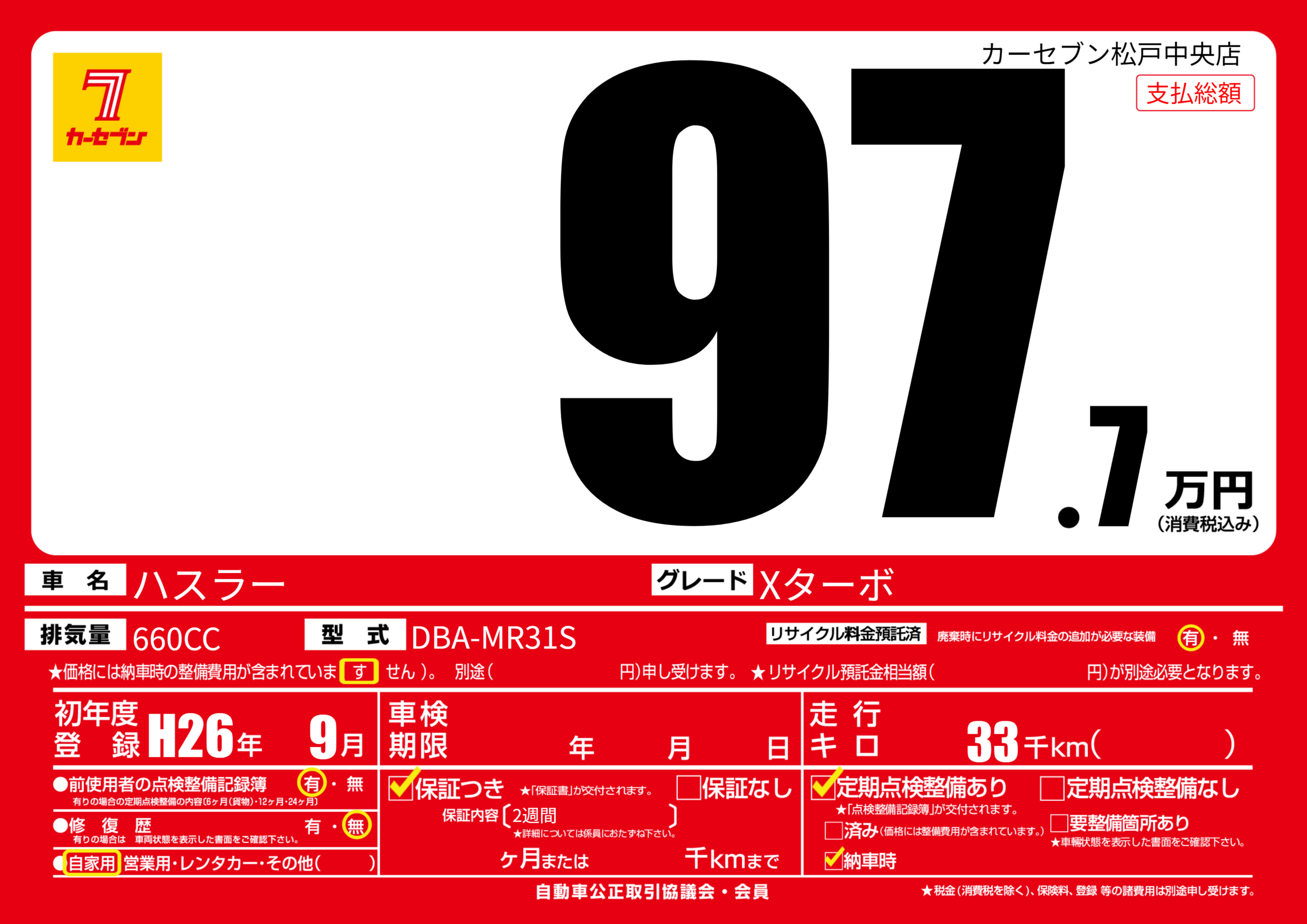 | 走行キロ | 3.3万km | 初年度登録 | H26年9月 |