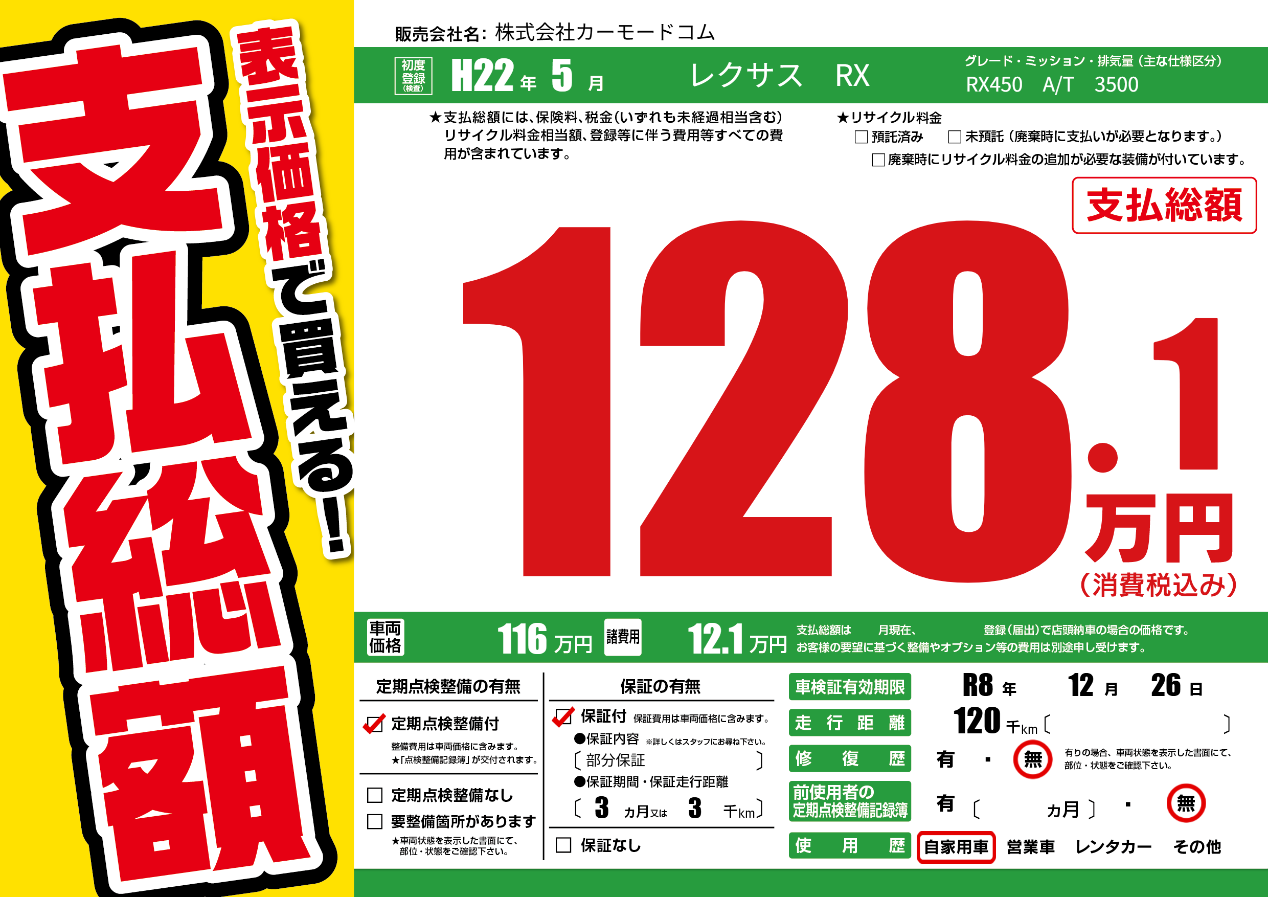 | 走行キロ | 12万km | 初年度登録 | H22年5月 |