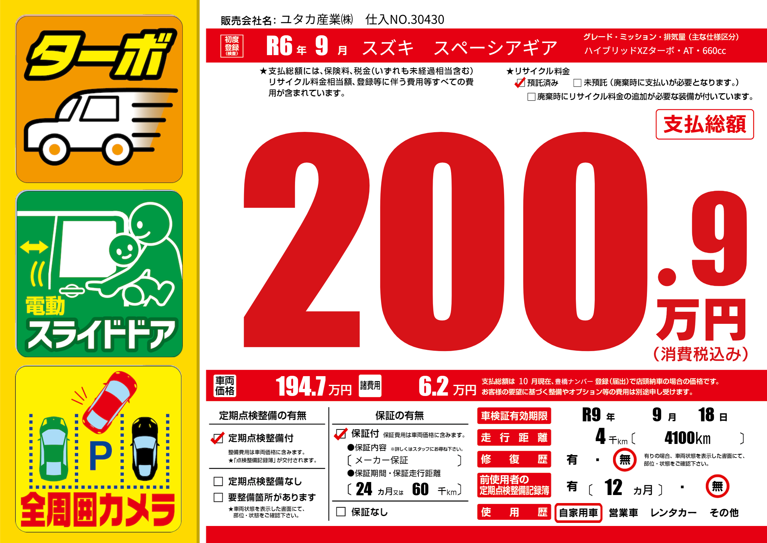 | 走行キロ | 0.4万km | 初年度登録 | R6年9月 |