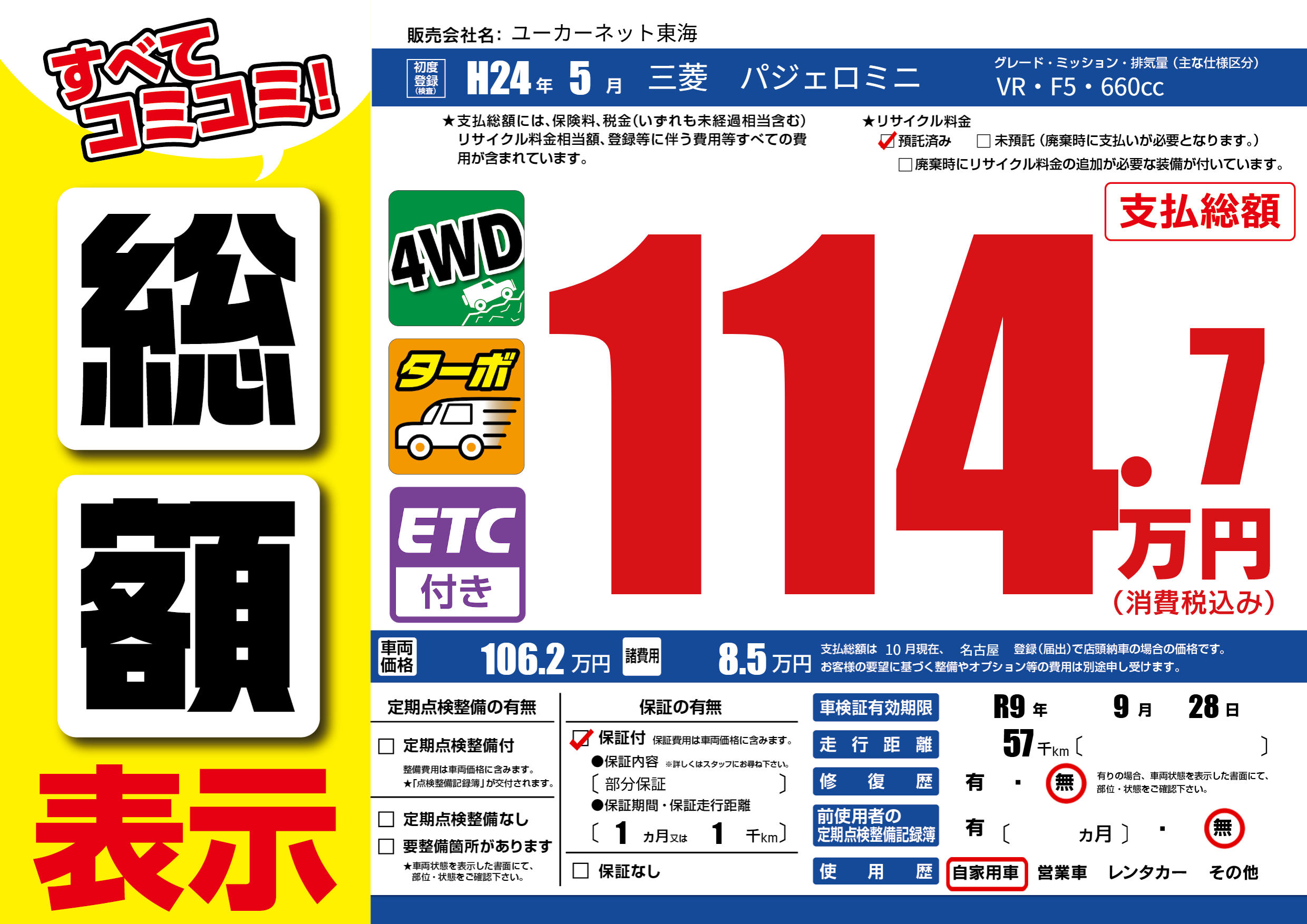 | 車名 | 三菱 パジェロミニ | グレード ミッション 排気量 |