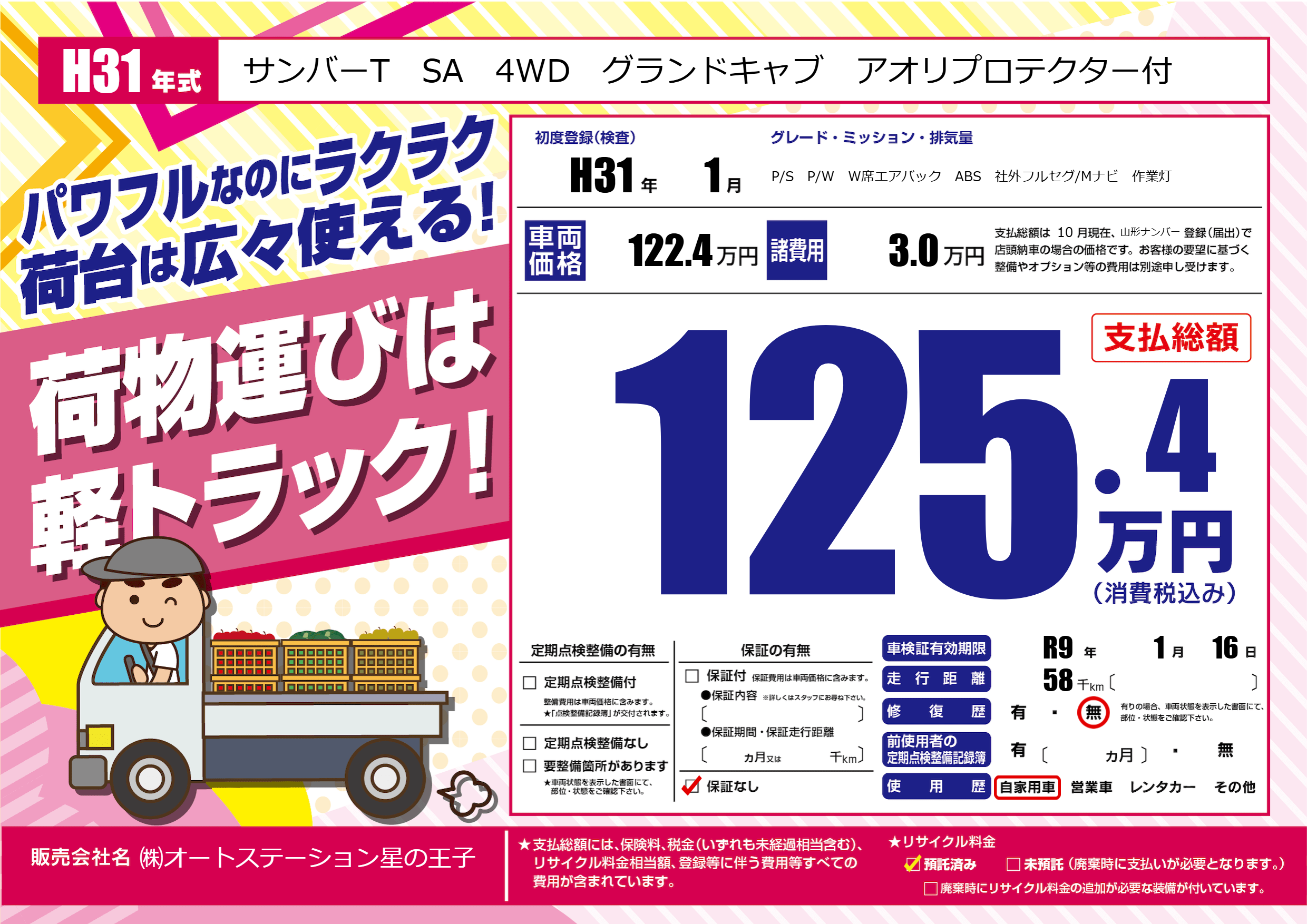 | 車名 | サンバーT SA 4WD グランドキャブ アオリプロテクター付 | グレード ミッション 排気量 |