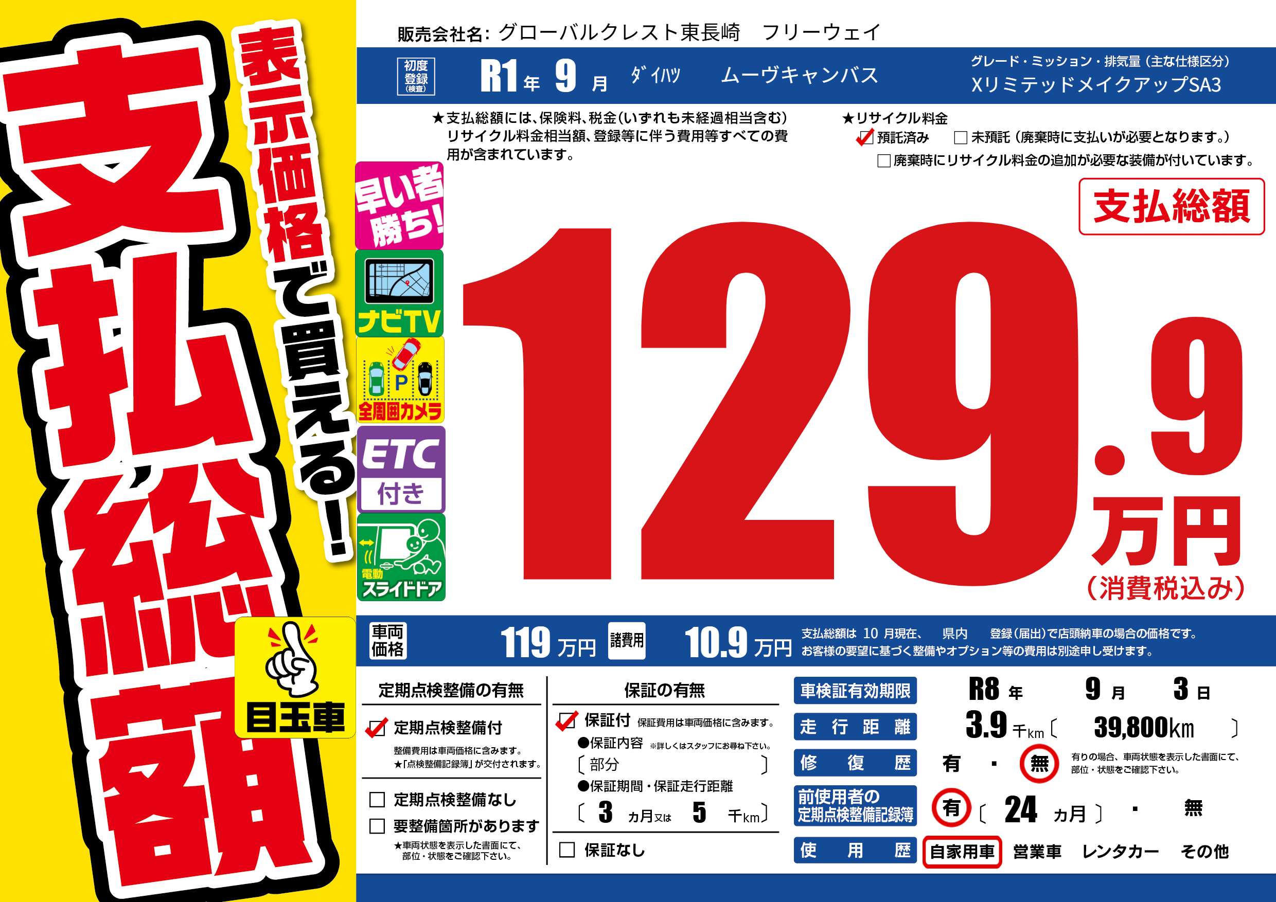 | 走行キロ | 0.3万km | 初年度登録 | R1年9月 |