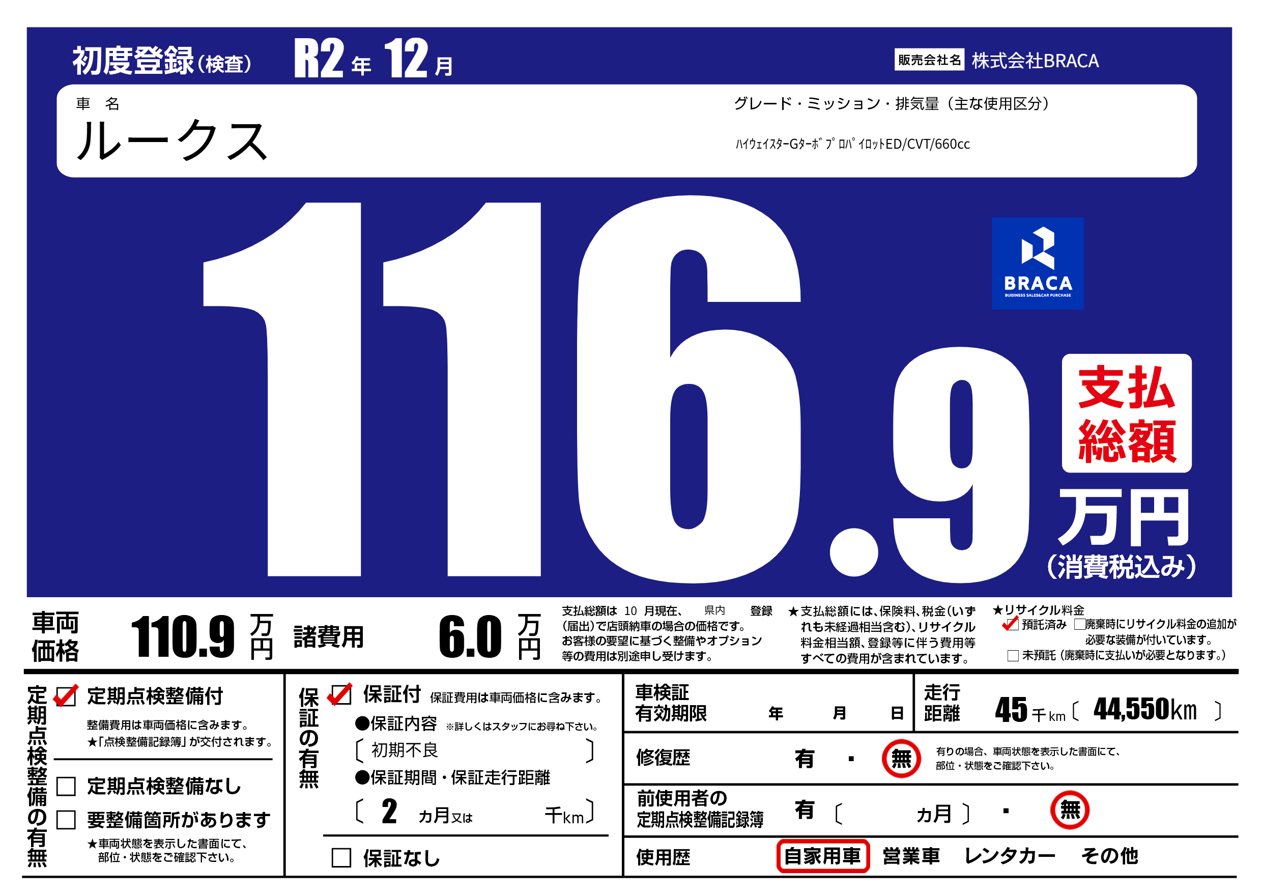 | 走行キロ | 4.5万km | 初年度登録 | R2年12月 |
