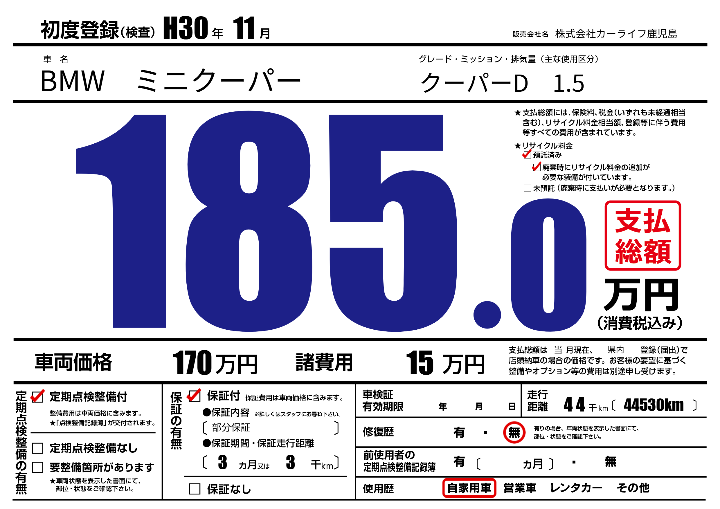 | 車名 | BMW ミニクーパー | グレード ミッション 排気量 |