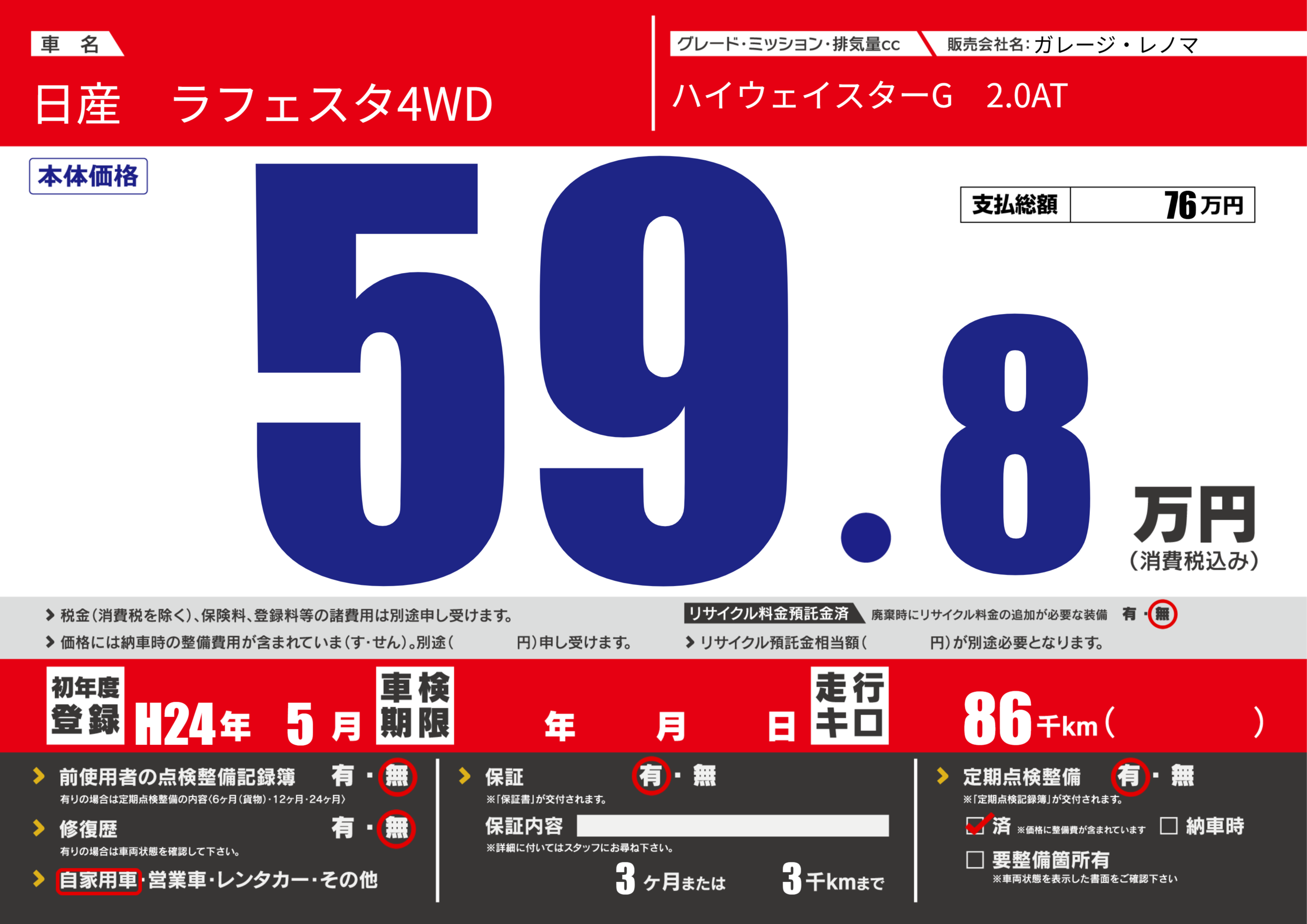 | 定期点検整備 | 定期点検整備あり 定期点検整備済み | ||