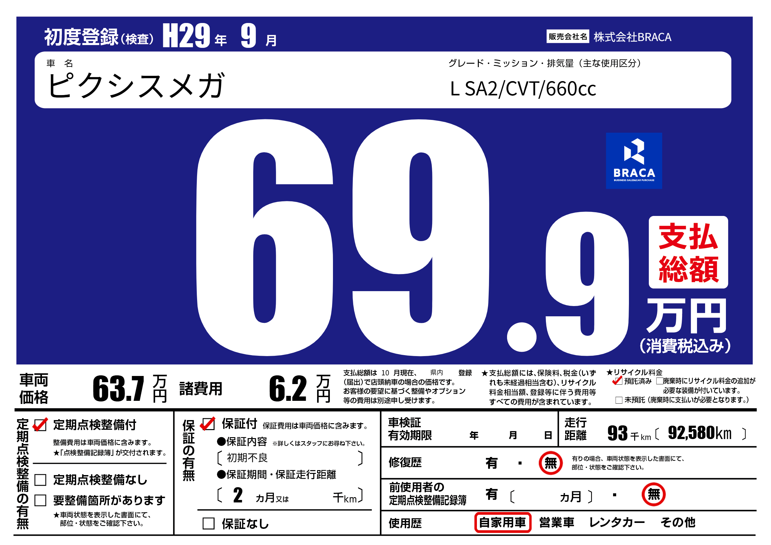 | 走行キロ | 9.3万km | 初年度登録 | H29年9月 |