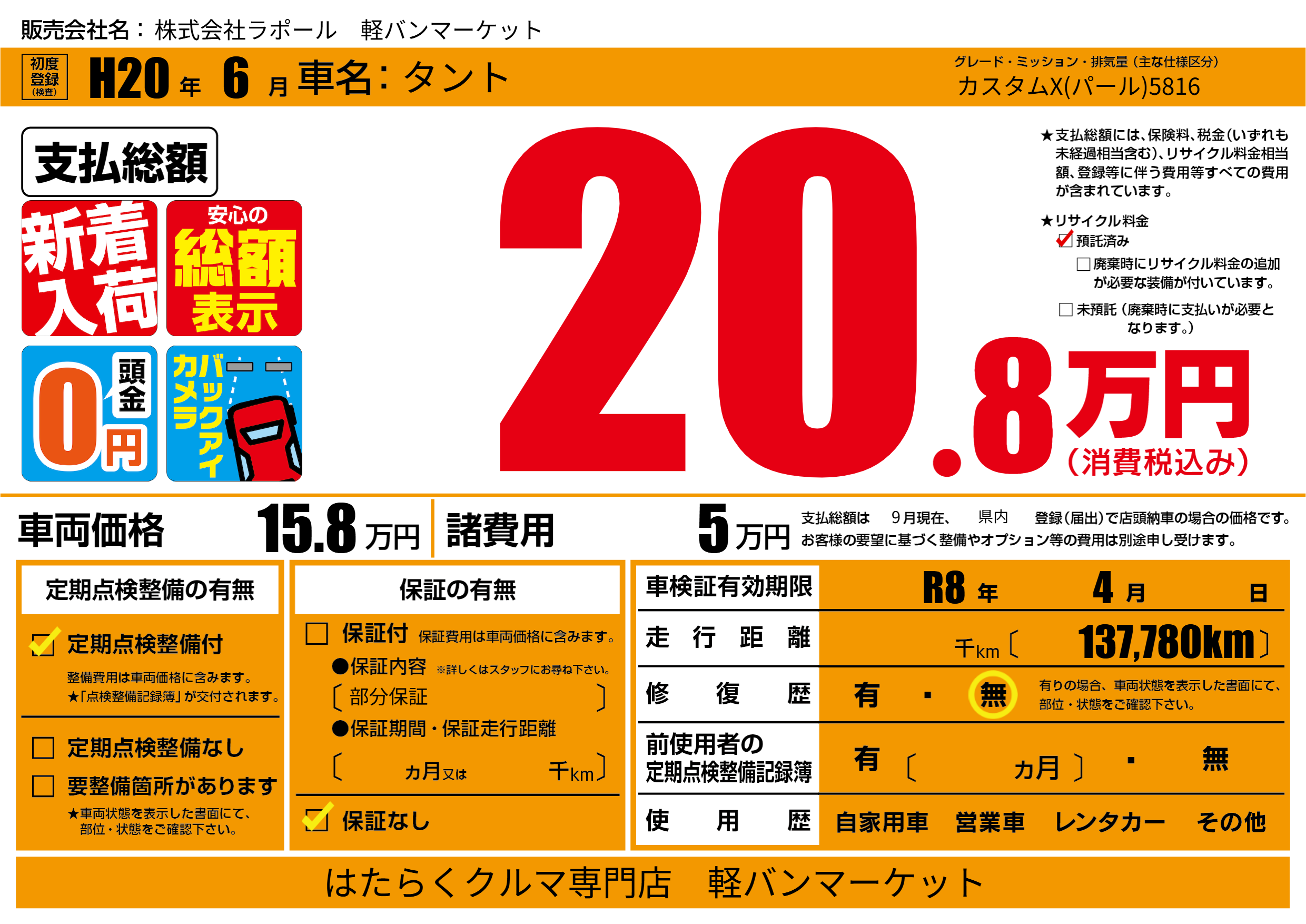 なし | 車検制限 | R8年4月---月 |