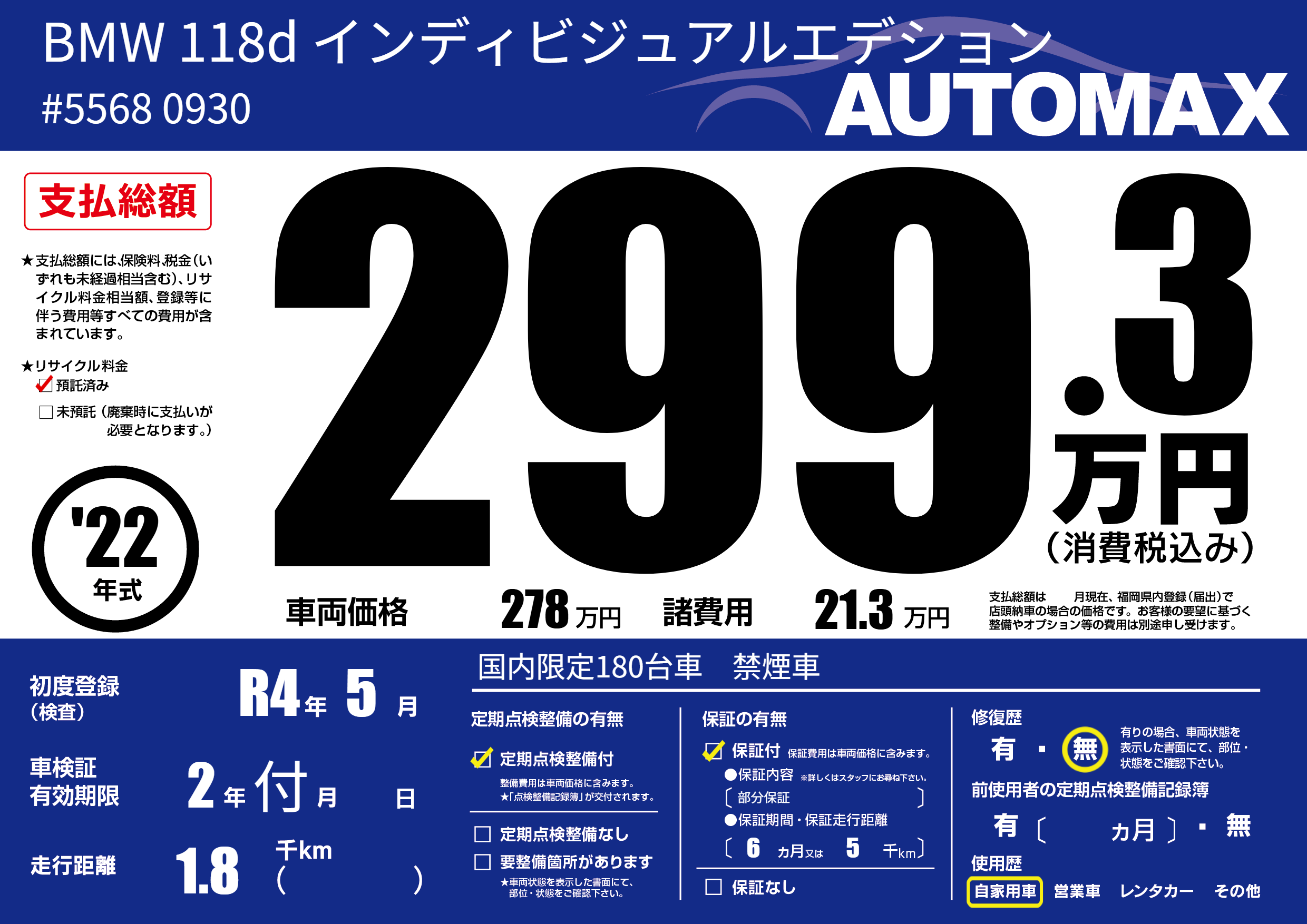 | 車名 | BMW 118d インディビジュアルエデション | グレード ミッション 排気量 |