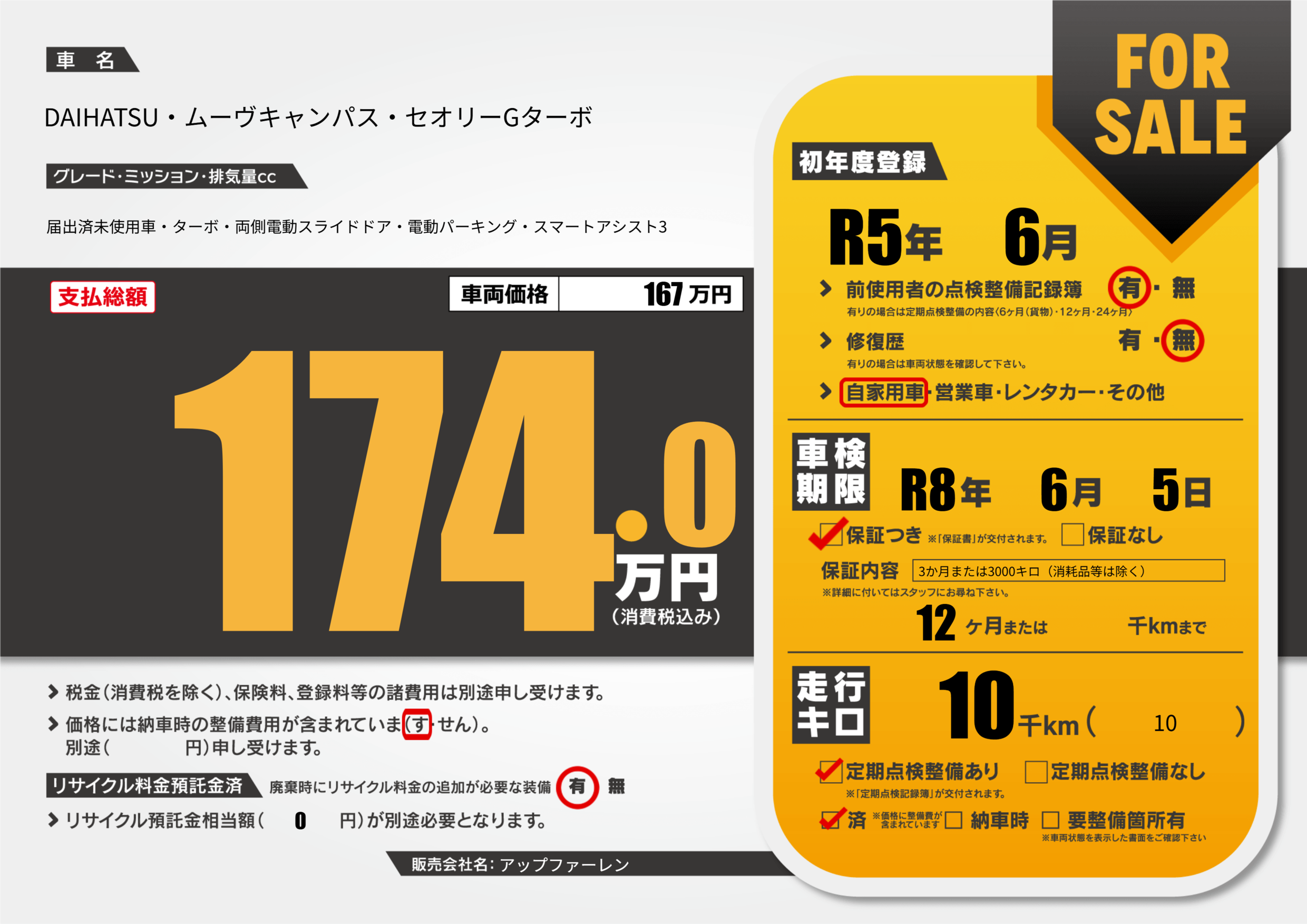 | 定期点検整備 | 定期点検整備あり 定期点検整備済み | ||