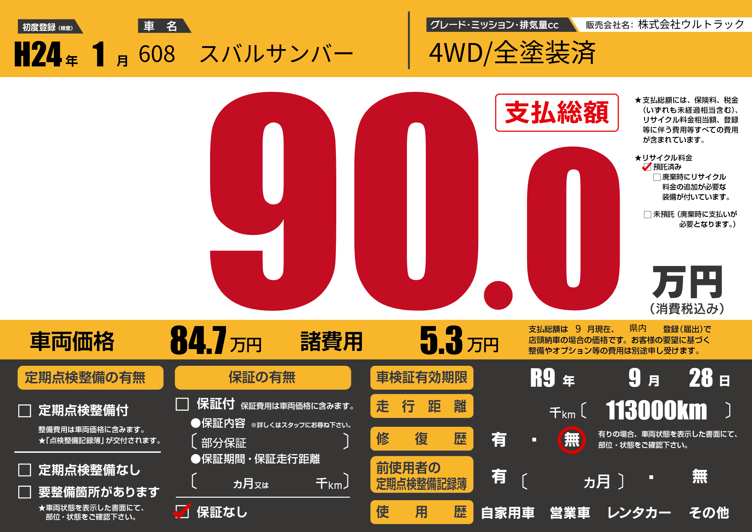 | 車名 | 608 スバルサンバー | グレード ミッション 排気量 |