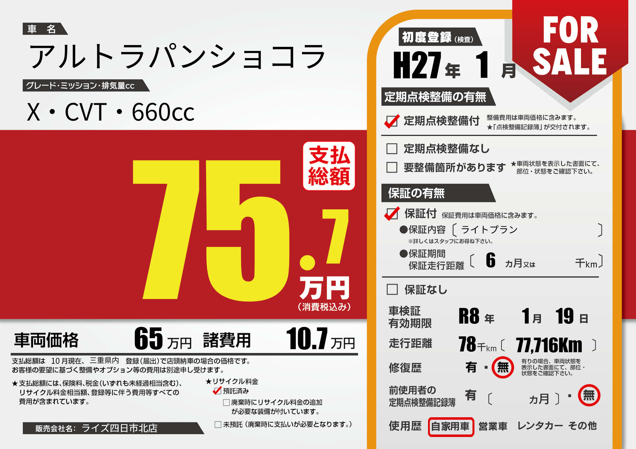 | 走行キロ | 7.8万km | 初年度登録 | H27年1月 |