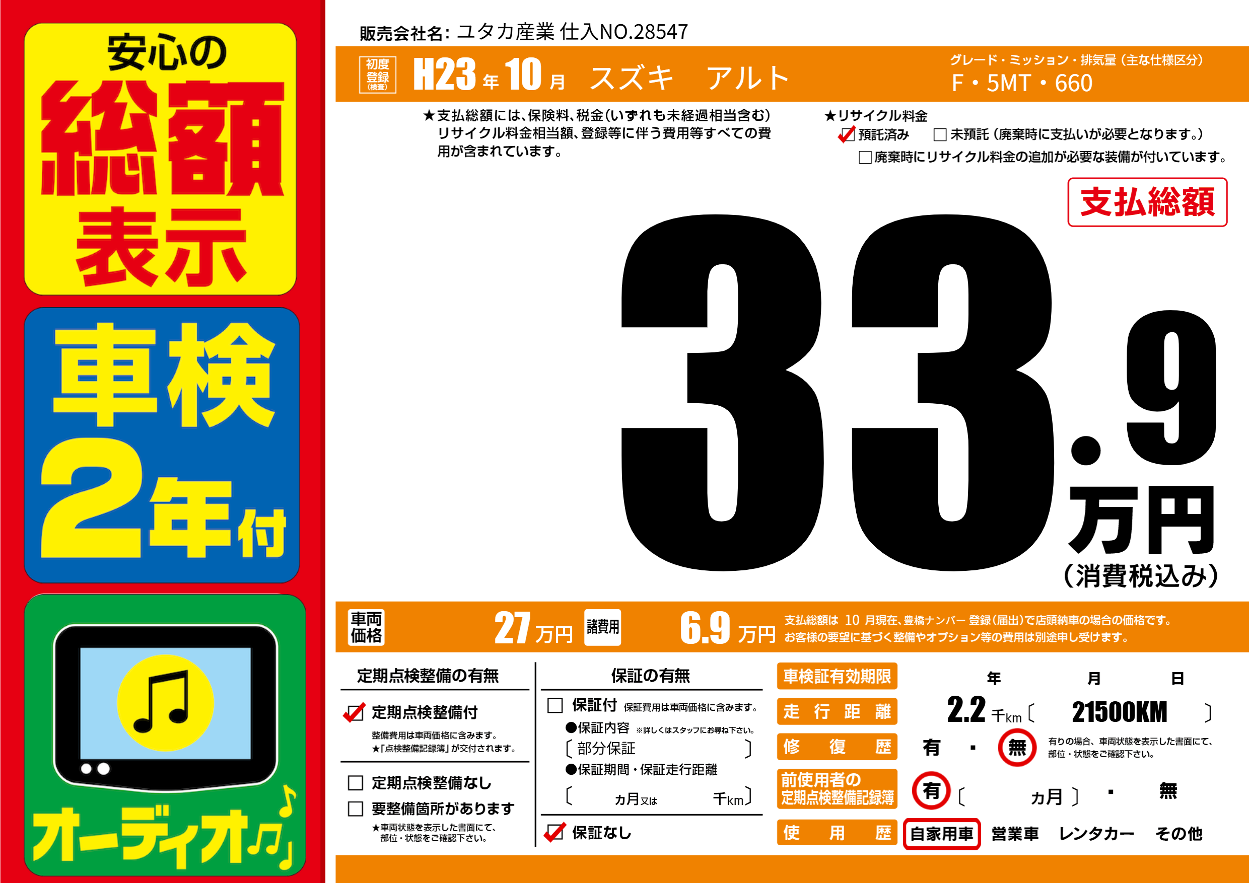 | 車名 | スズキ アルト | グレード ミッション 排気量 |