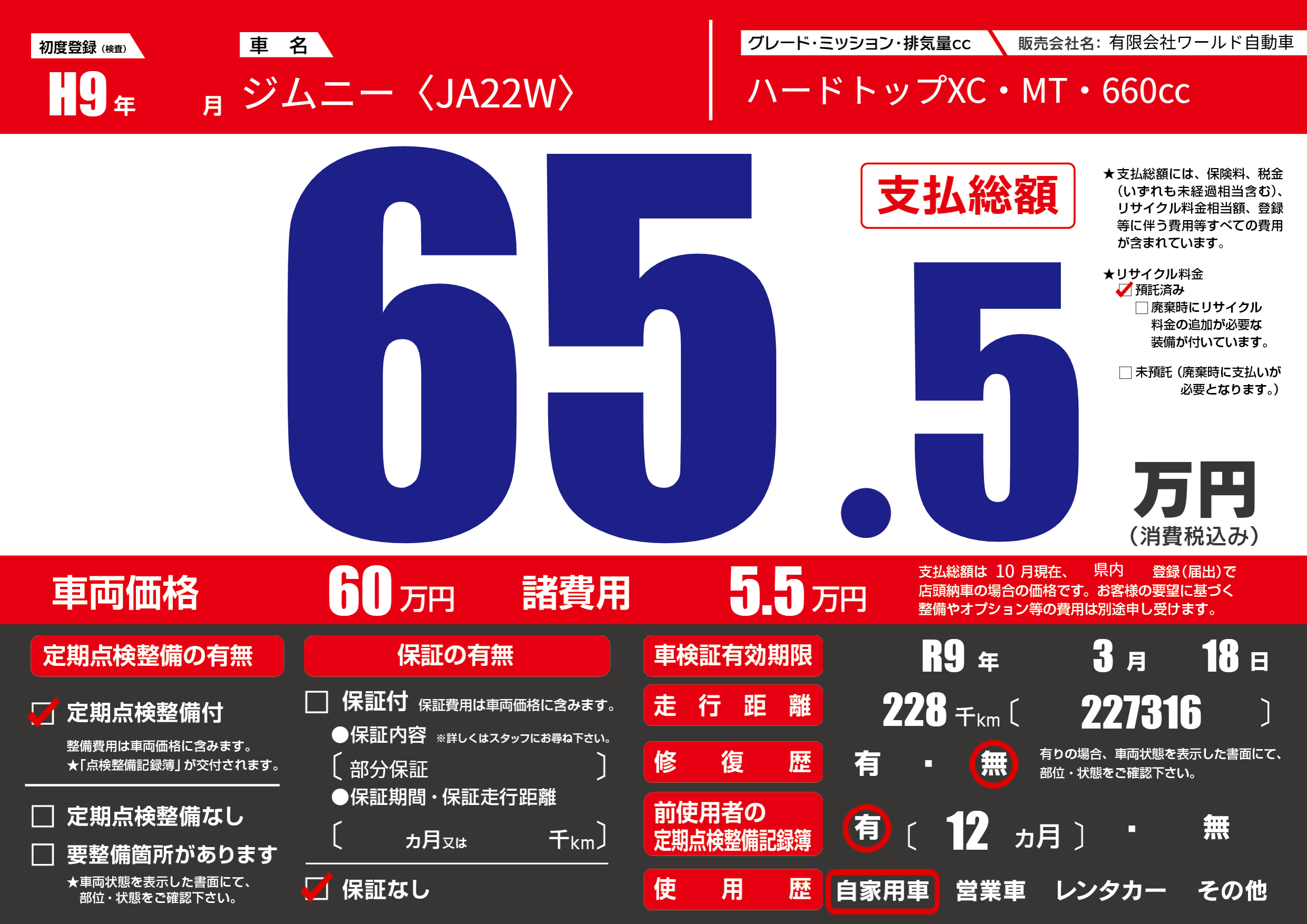 | 車名 | ジムニー〈JA22W〉 | グレード ミッション 排気量 |