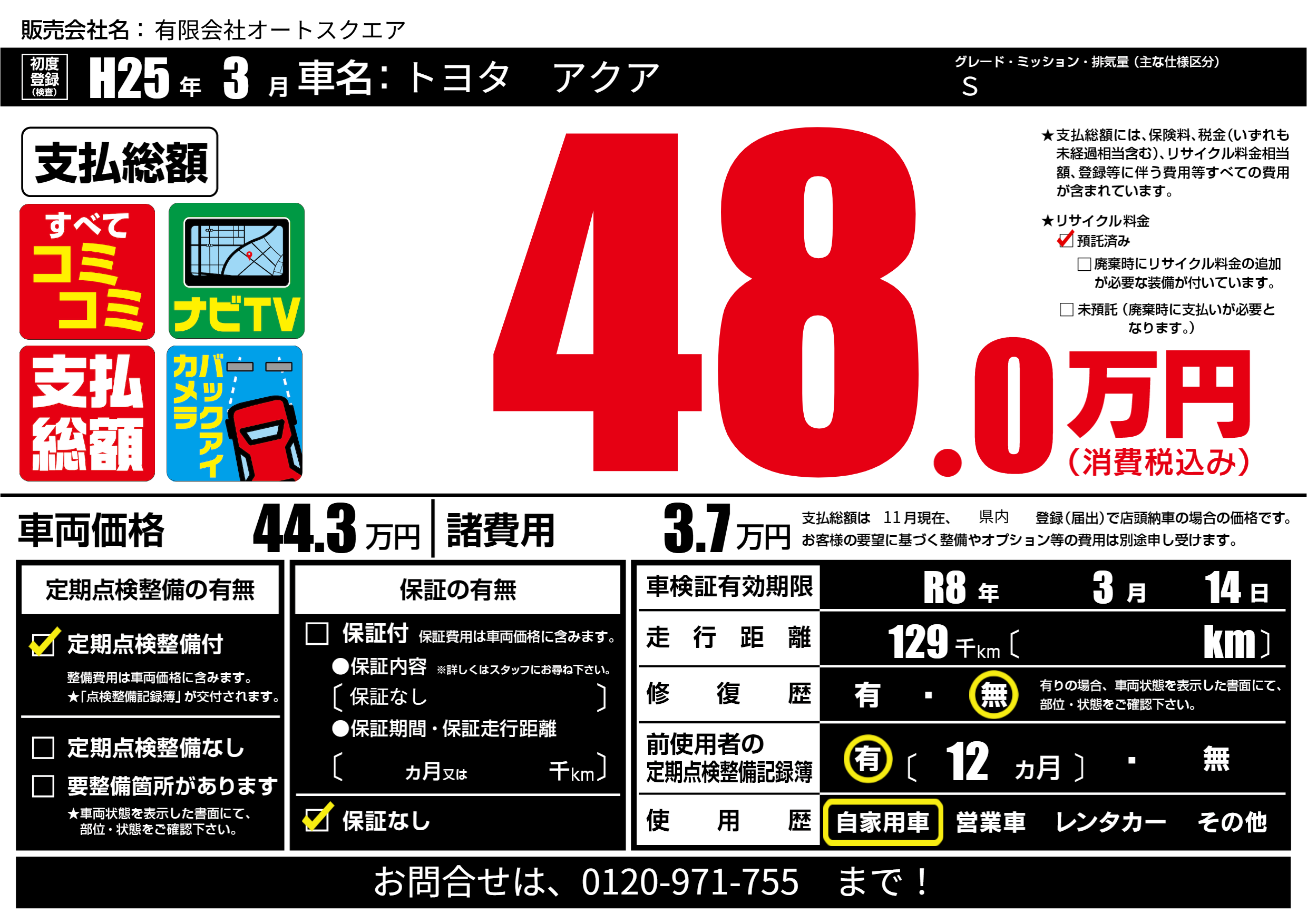 | 走行キロ | 12.9万km | 初年度登録 | H25年3月 |
