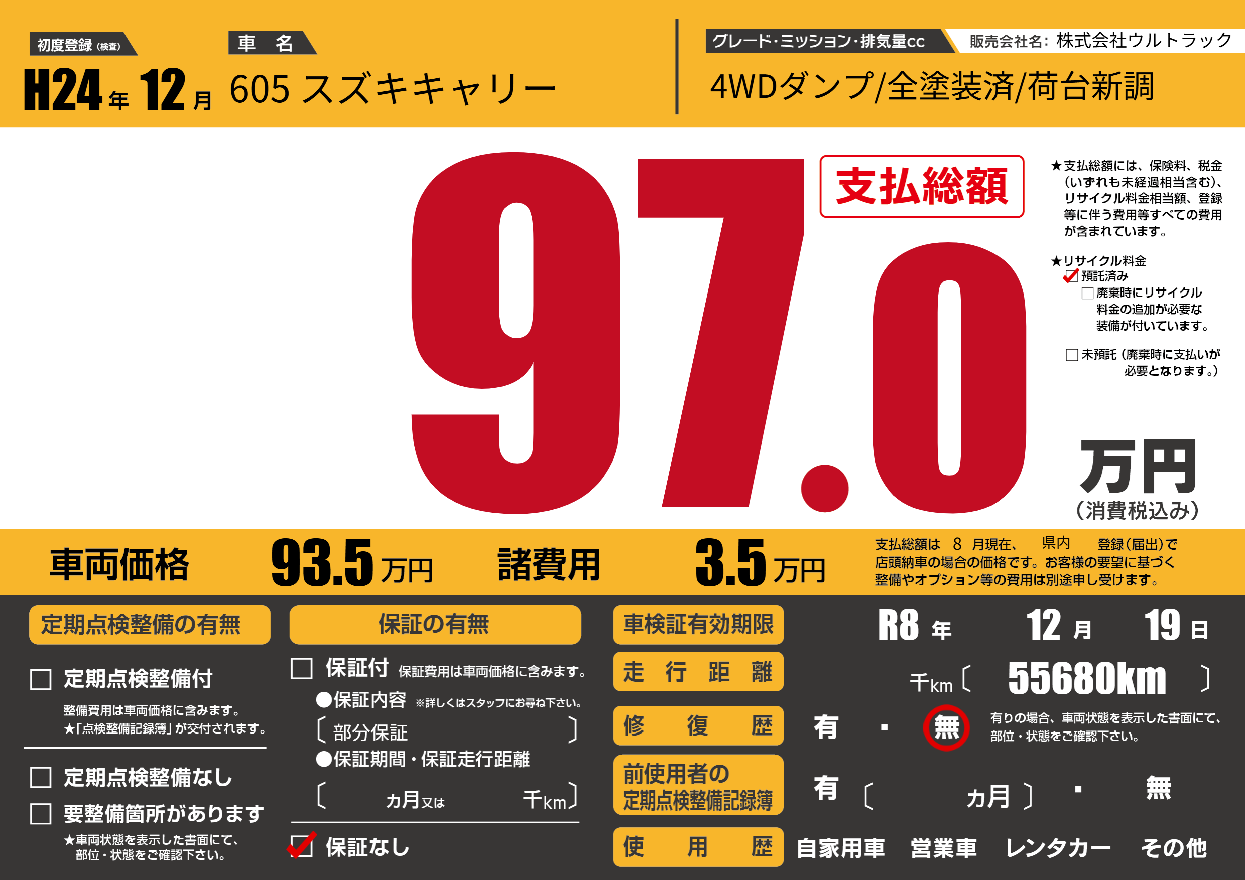 | 車名 | 605 スズキキャリー | グレード ミッション 排気量 |