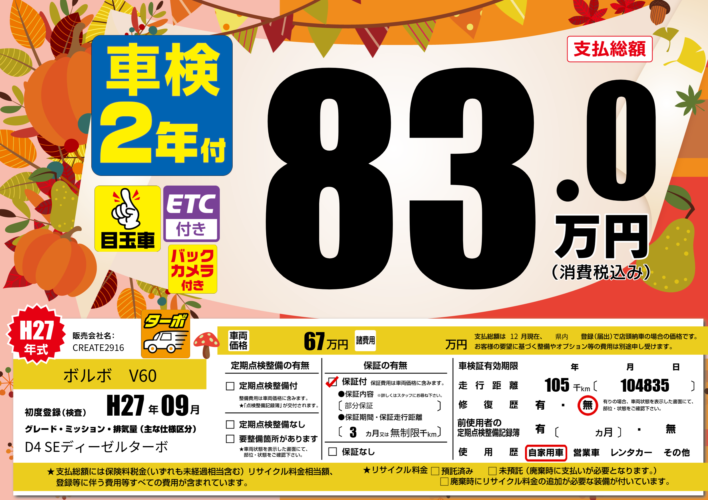 | 走行キロ | 10.5万km | 初年度登録 | H27年09月 |