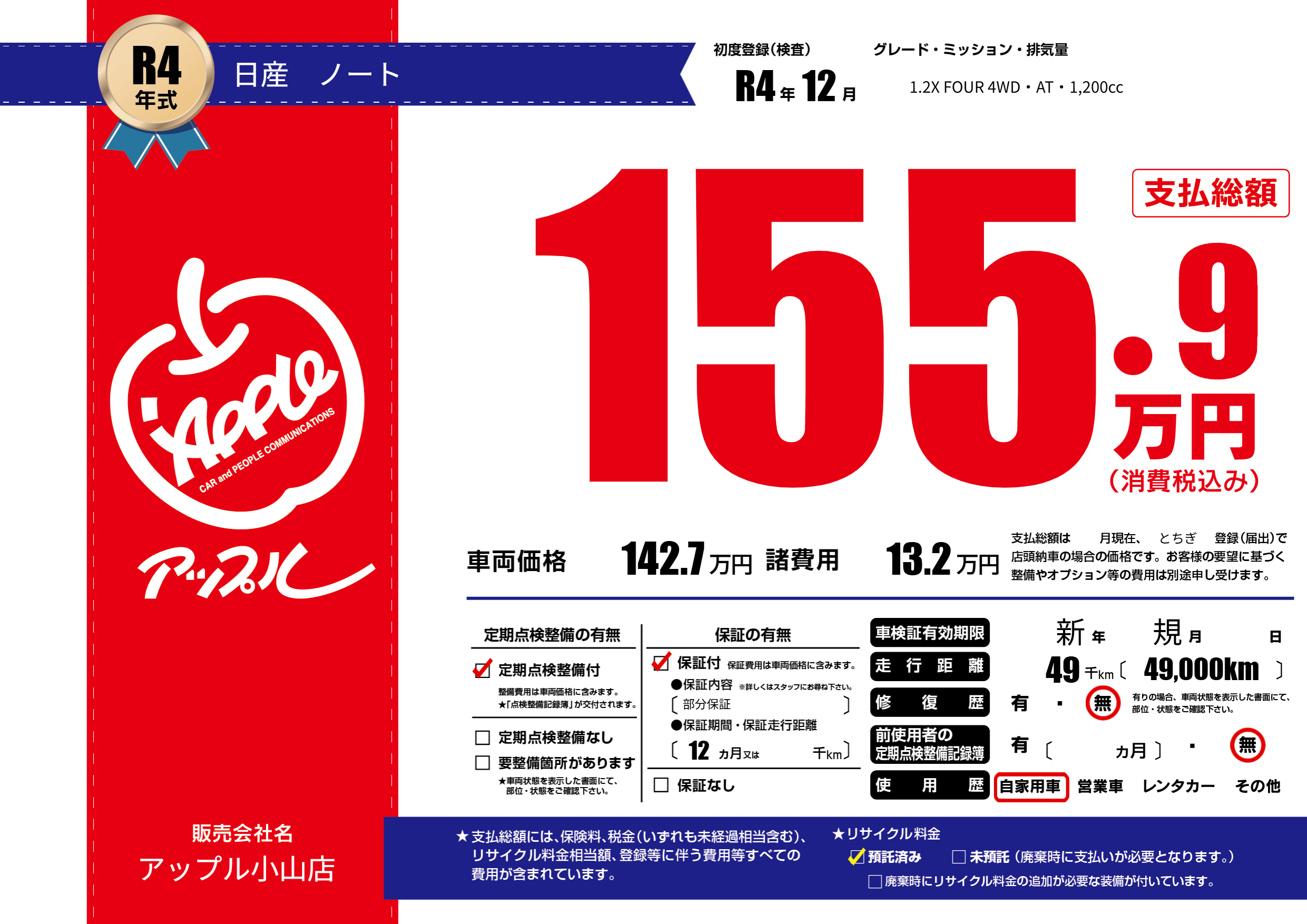 | 走行キロ | 4.9万km | 初年度登録 | R4年12月 |