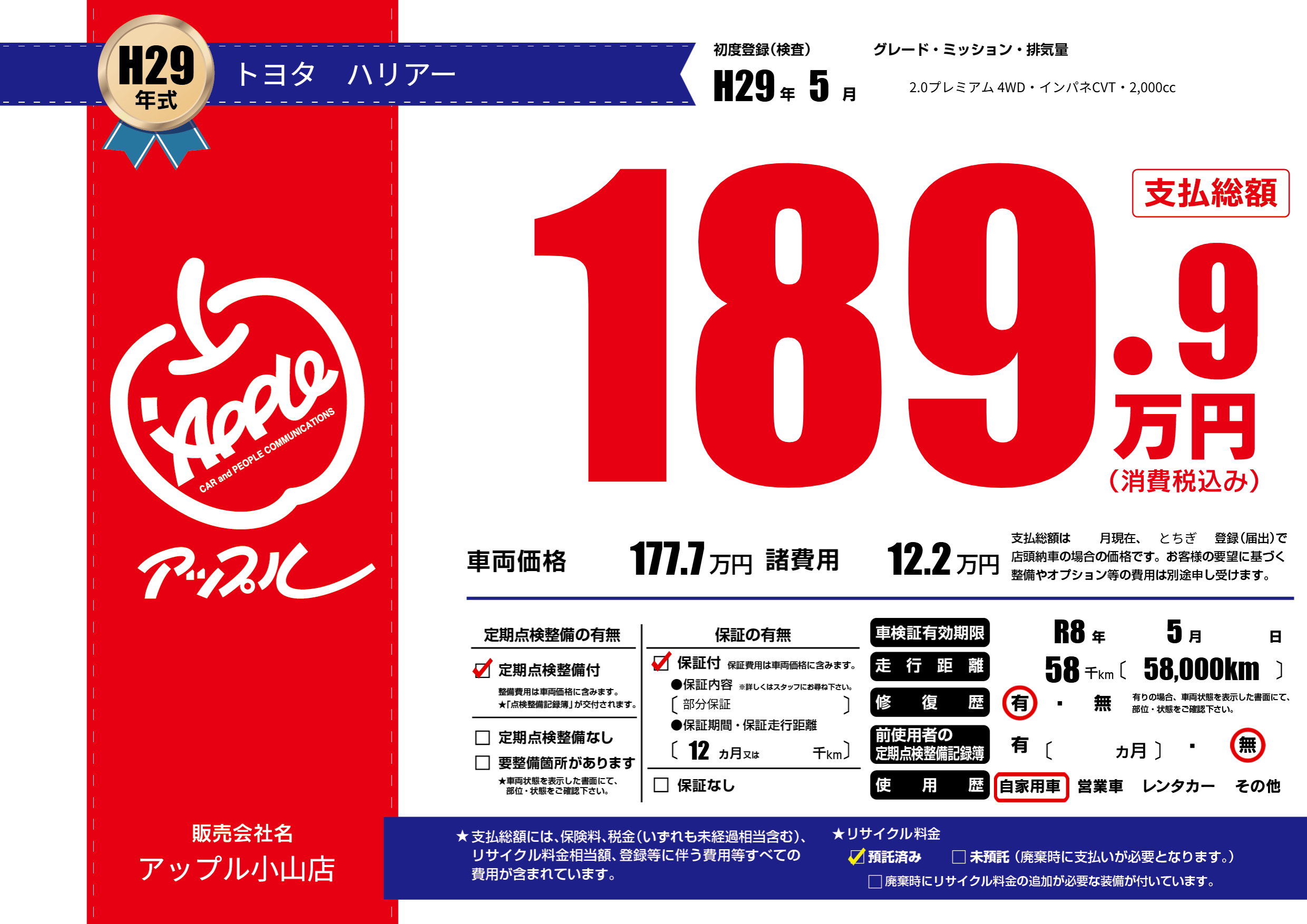 | 走行キロ | 5.8万km | 初年度登録 | H29年5月 |