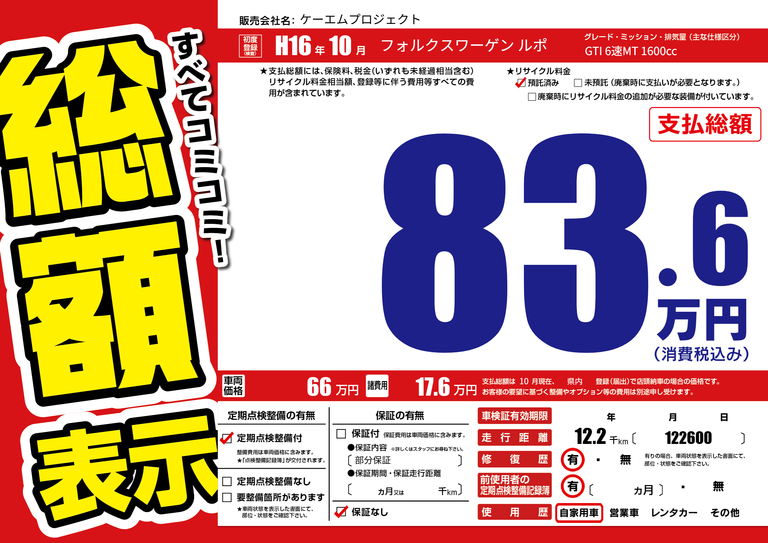 | 車名 | フォルクスワーゲン ルポ | グレード ミッション 排気量 |