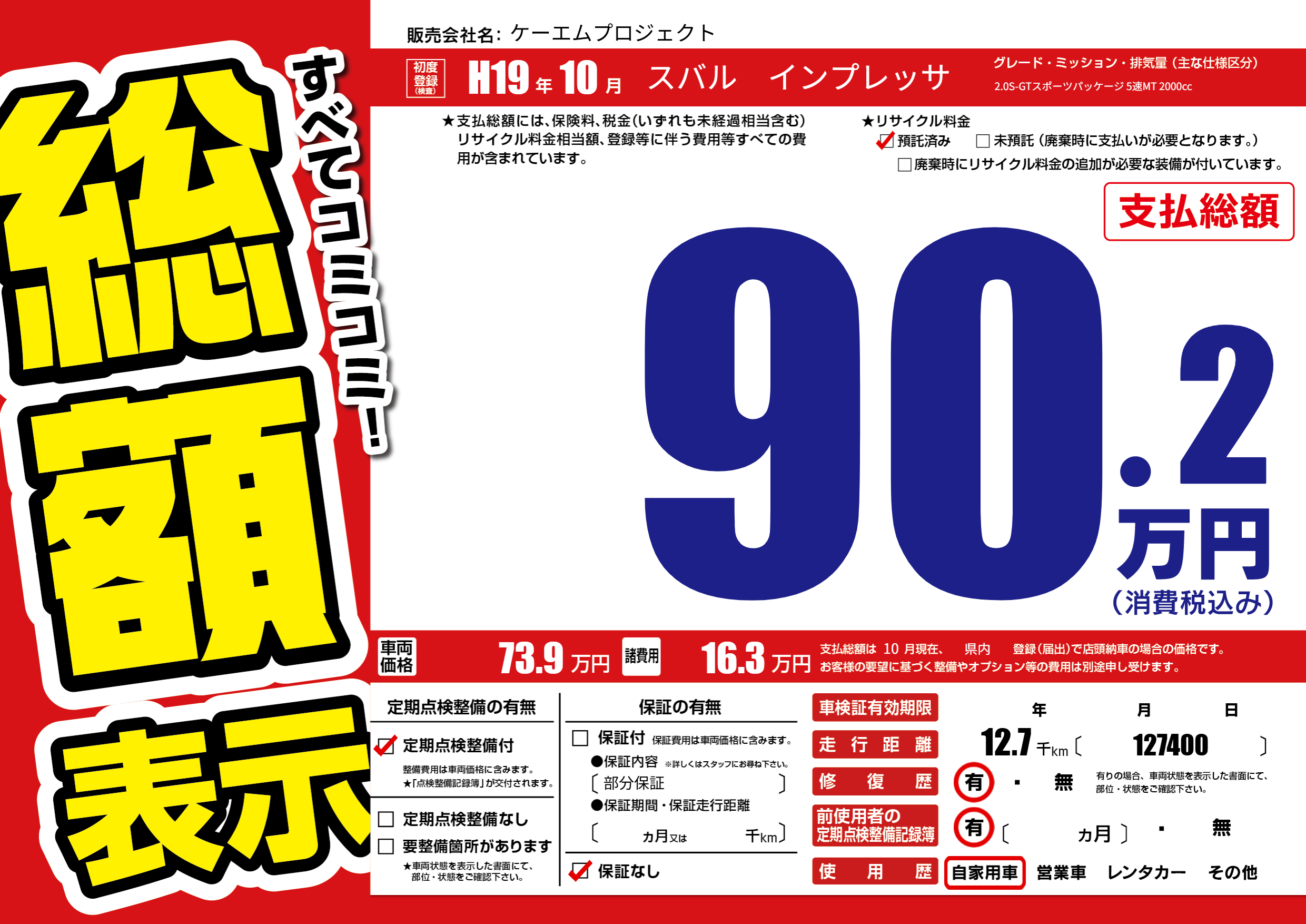 | 車名 | スバル インプレッサ | グレード ミッション 排気量 |
