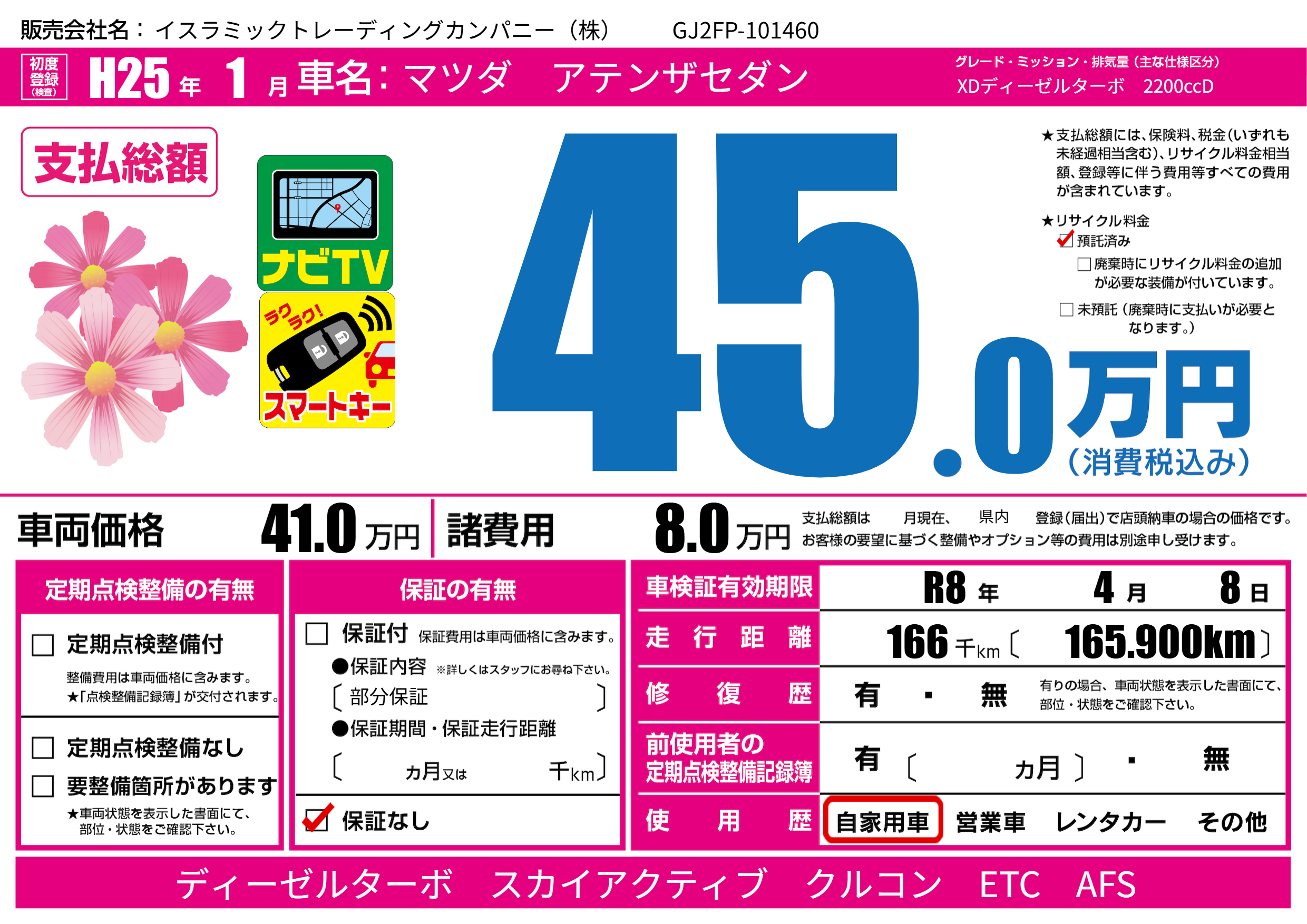 | 走行キロ | 16.6万km | 初年度登録 | H25年1月 |