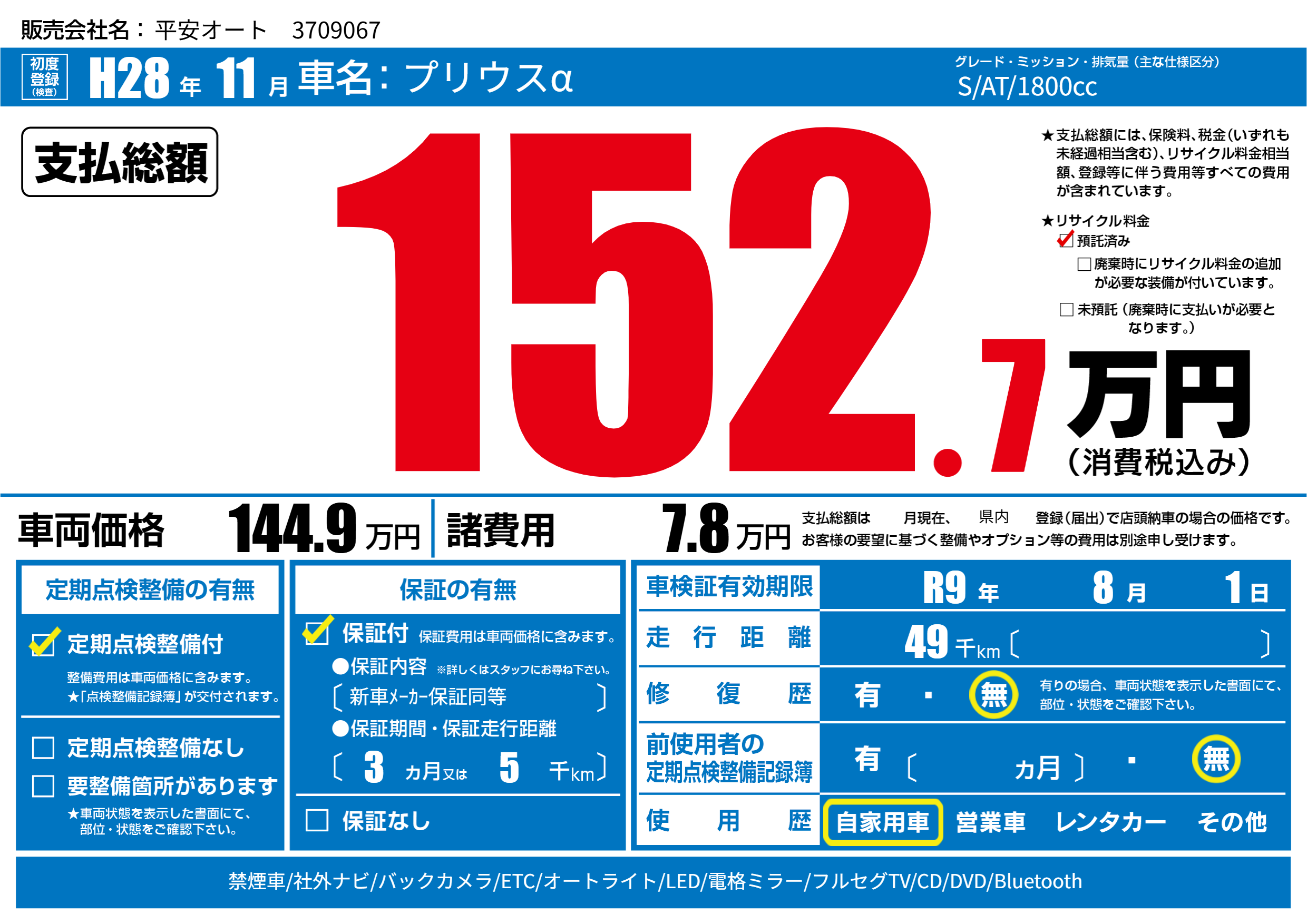 なし | 車検制限 | R9年8月1月 |