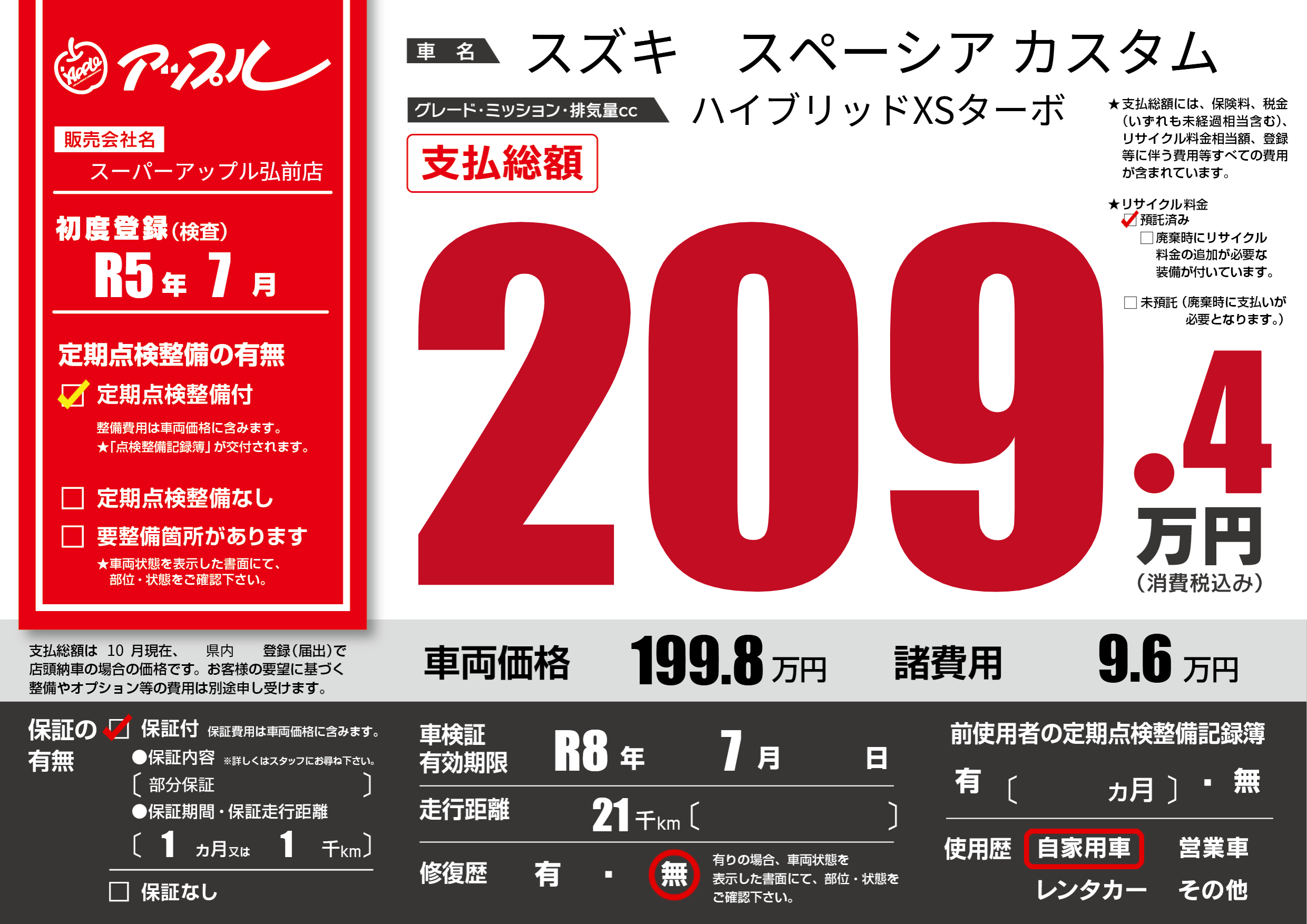 | 走行キロ | 2.1万km | 初年度登録 | R5年7月 |