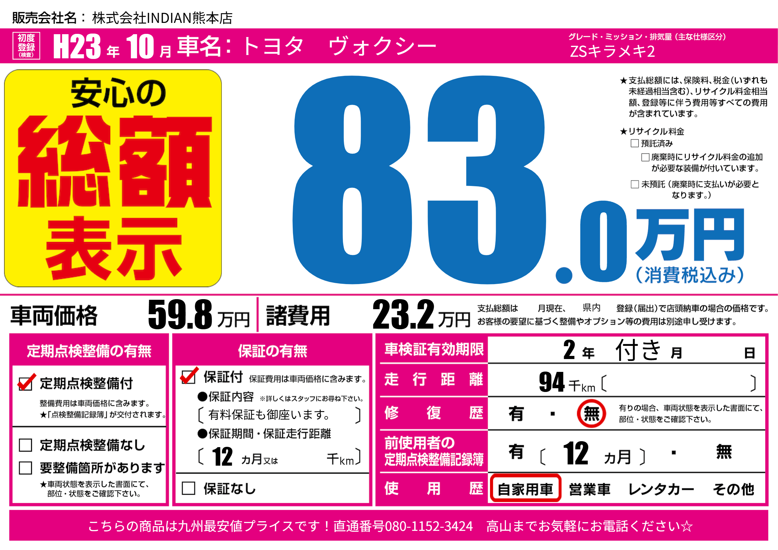 | 走行キロ | 9.4万km | 初年度登録 | H23年10月 |