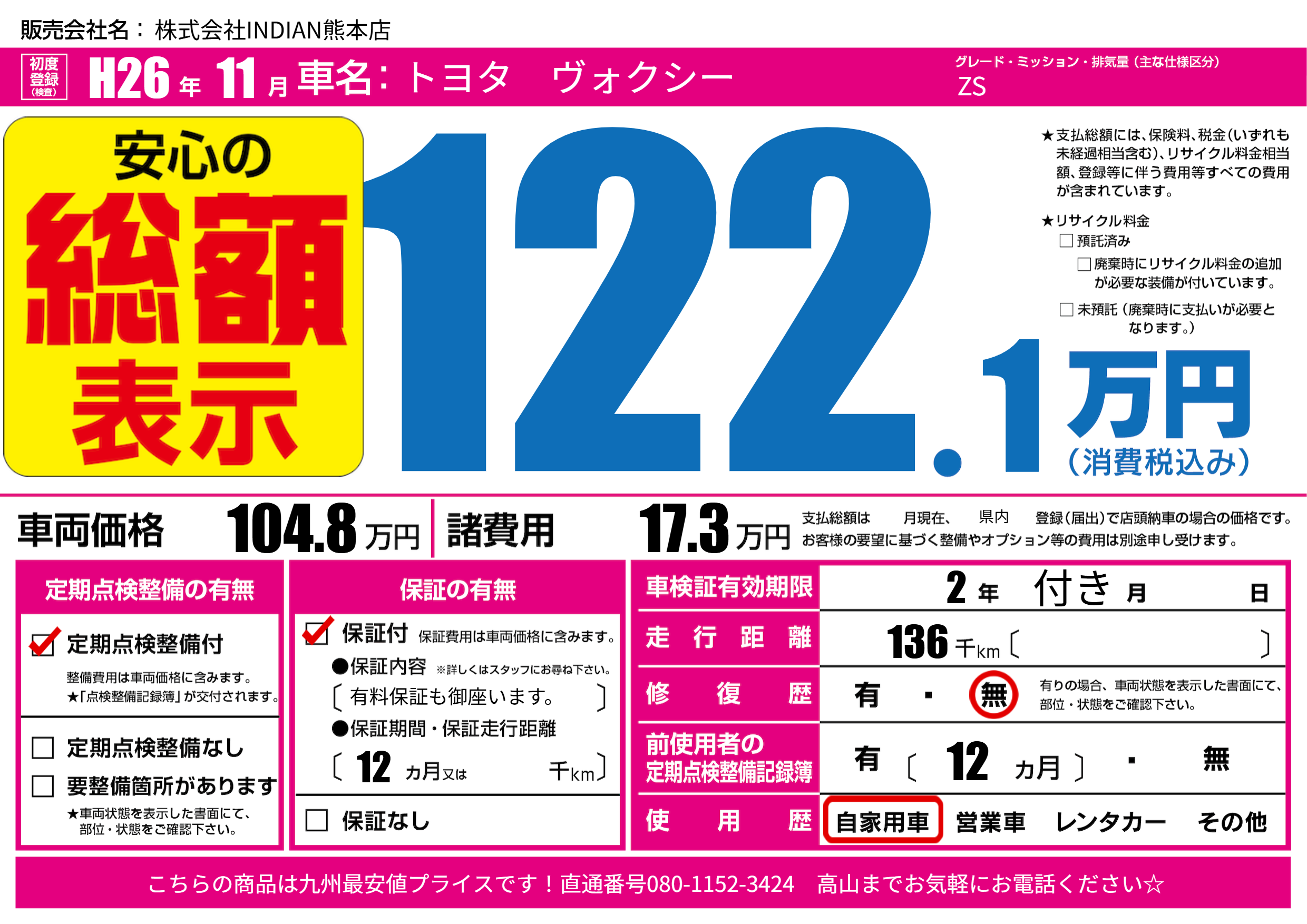 | 走行キロ | 13.6万km | 初年度登録 | H26年11月 |