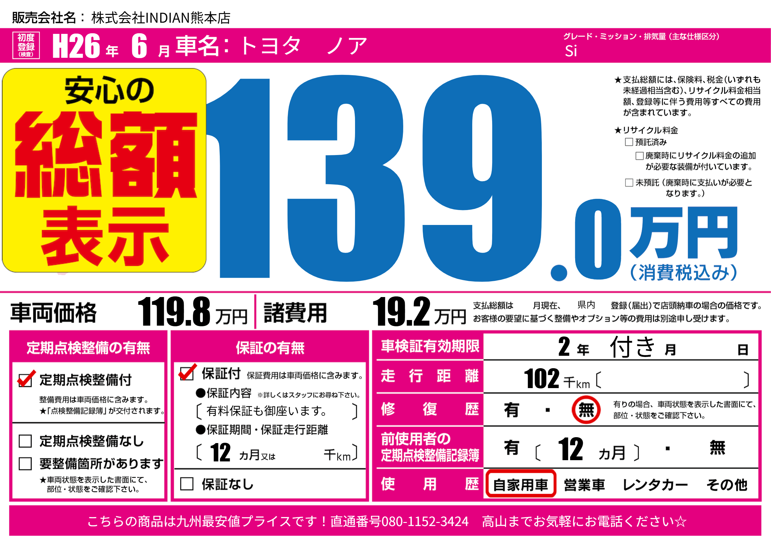 | 走行キロ | 10.2万km | 初年度登録 | H26年6月 |