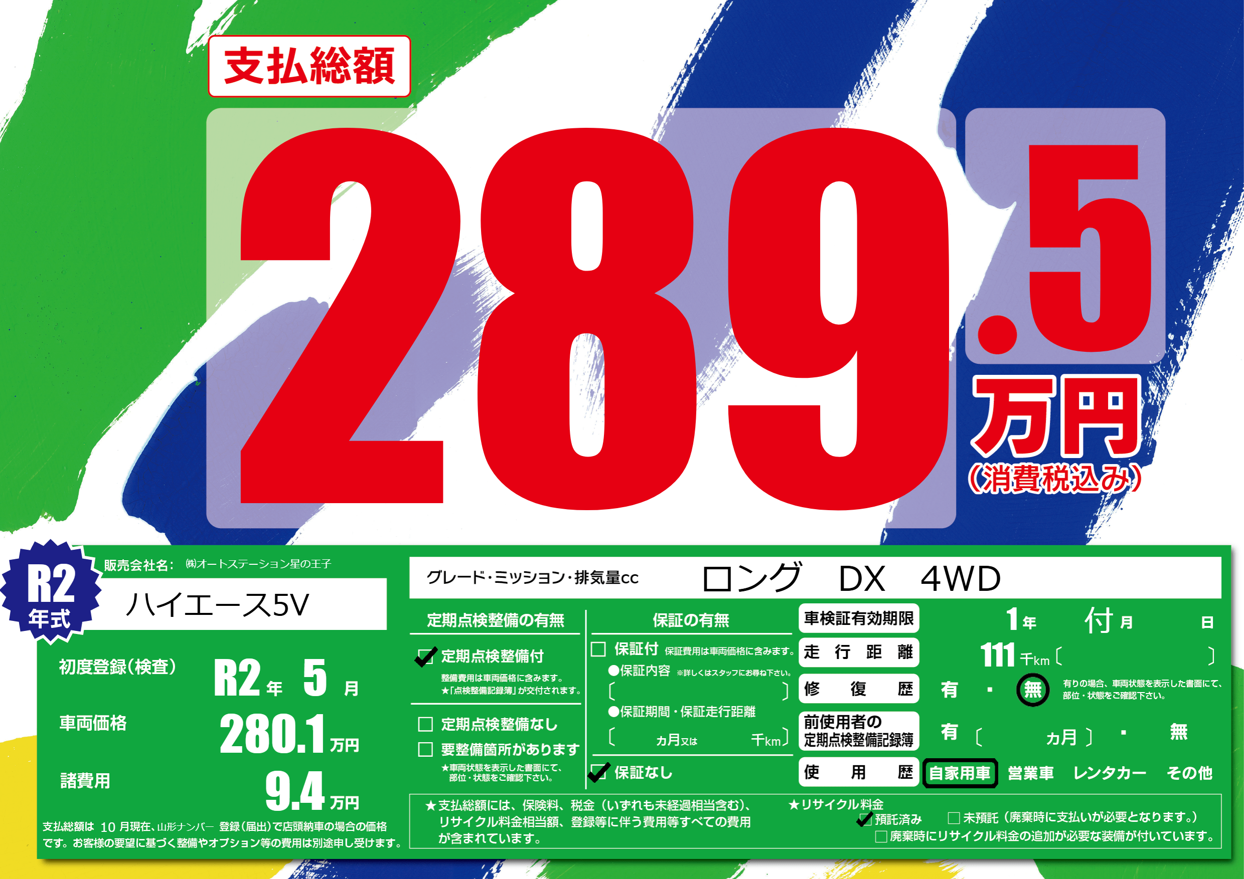 | 車名 | ハイエース5V | グレード ミッション 排気量 |