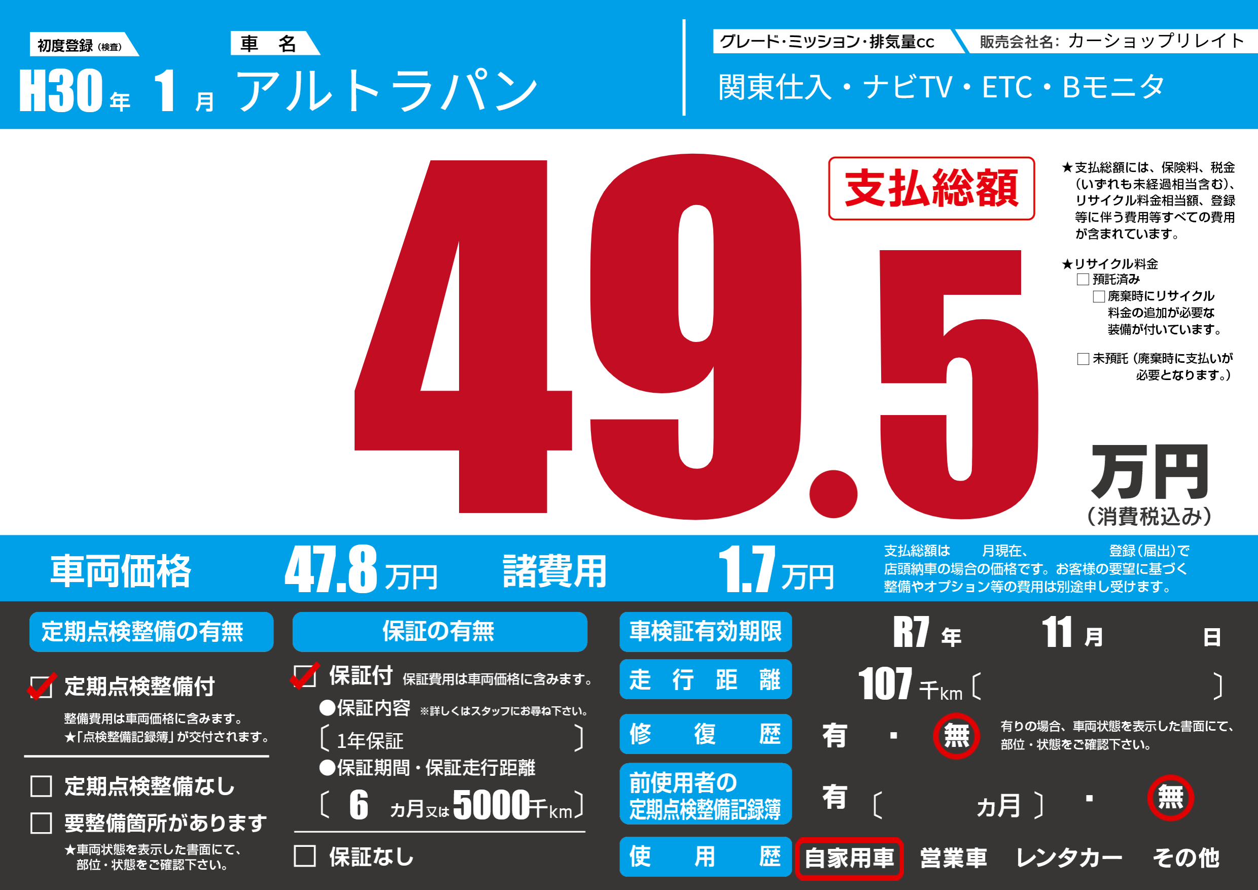 | 車検制限 | R7年 11月 - 日 | ||