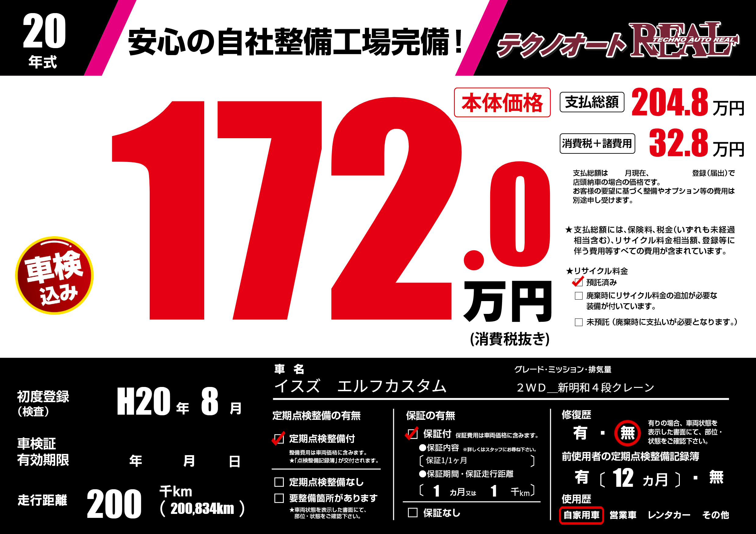 | 走行キロ | 20万km | 初年度登録 | H20年8月 |