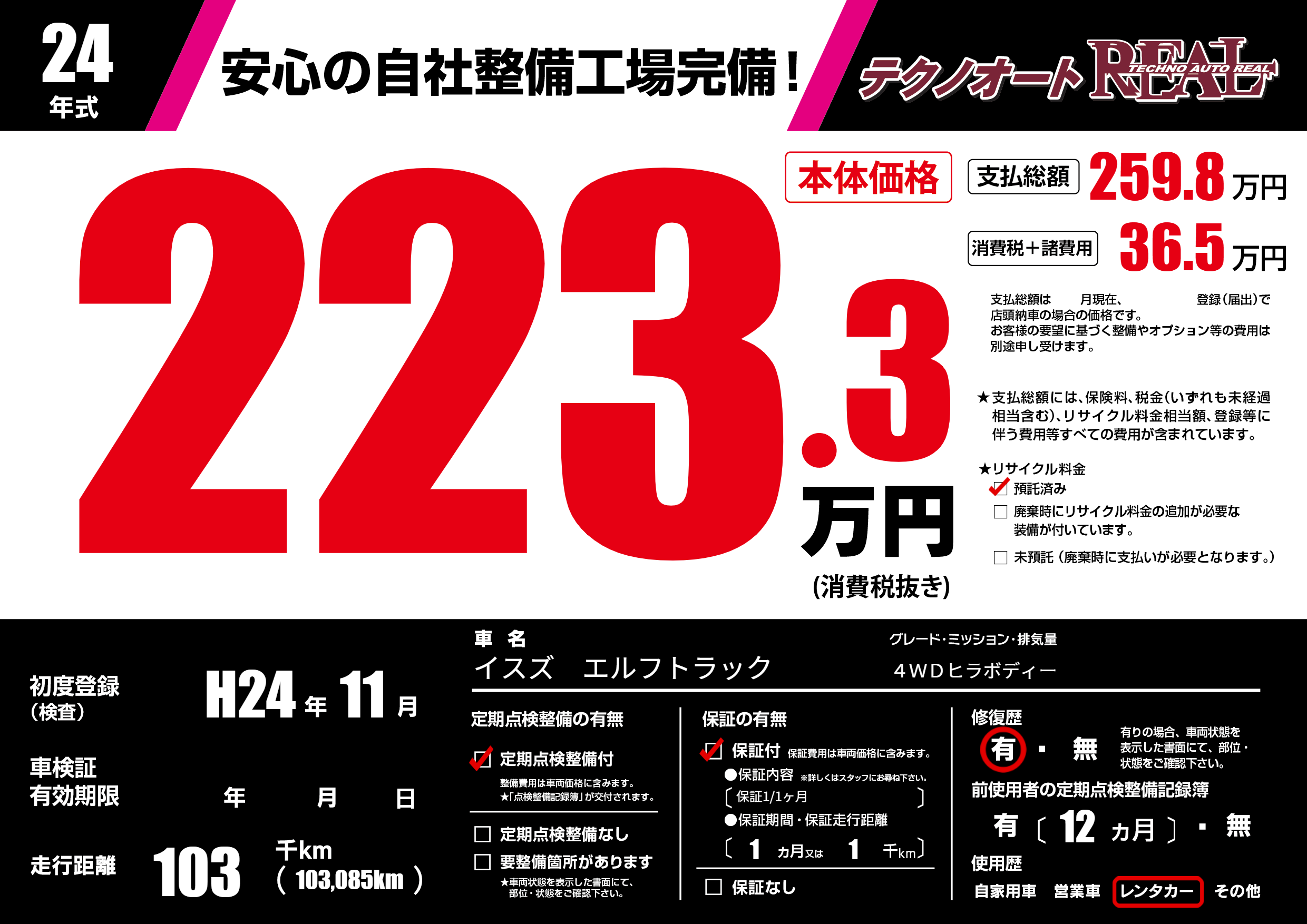 | 走行キロ | 10.3万km | 初年度登録 | H24年11月 |