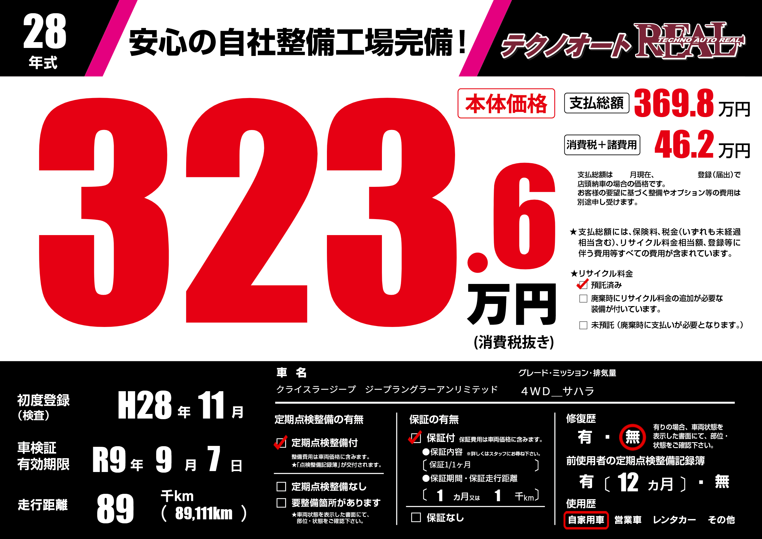 | 車名 | クライスラージープ ジープラングラーアンリミテッド | グレード ミッション 排気量 |