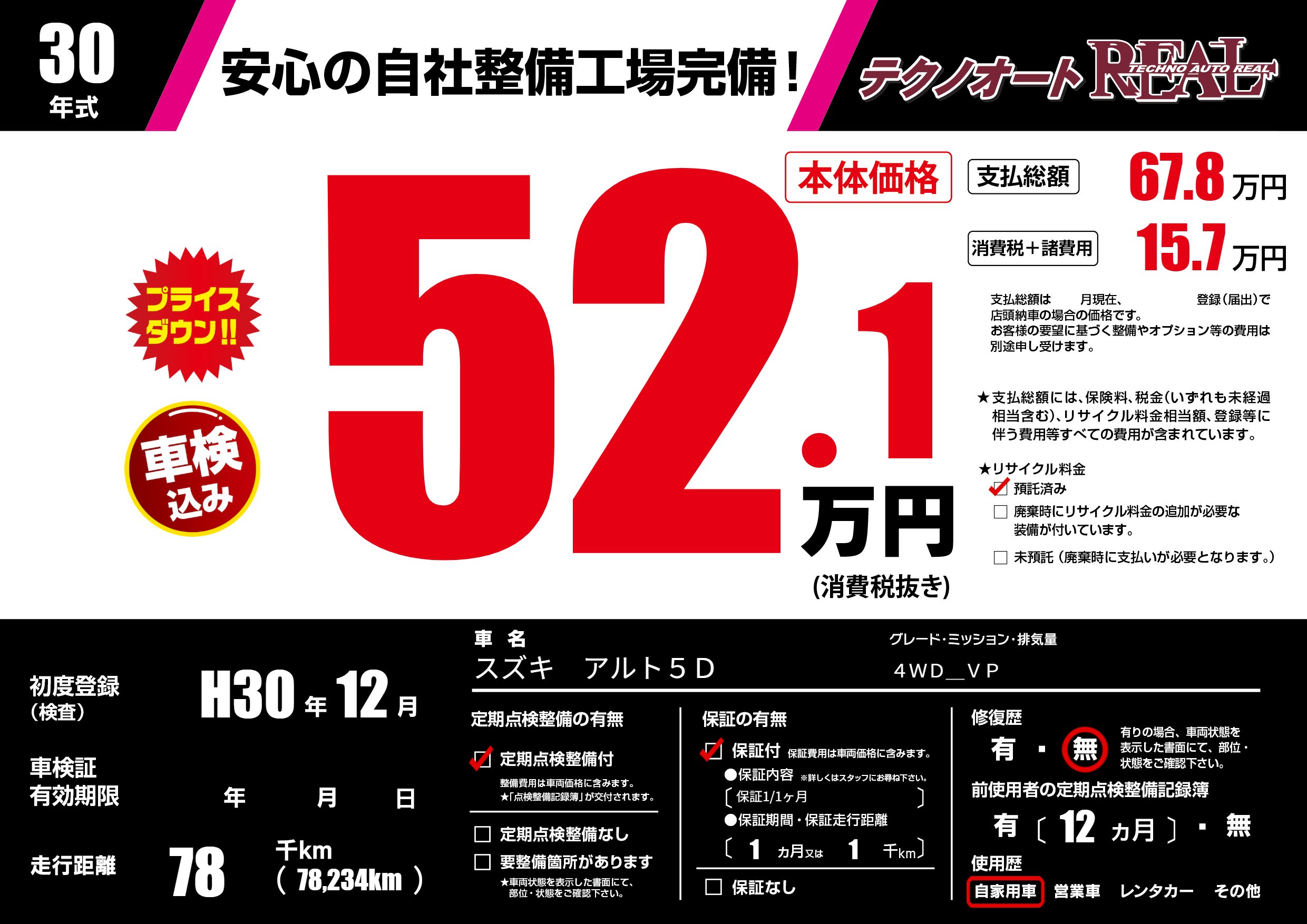 | 走行キロ | 7.8万km | 初年度登録 | H30年12月 |