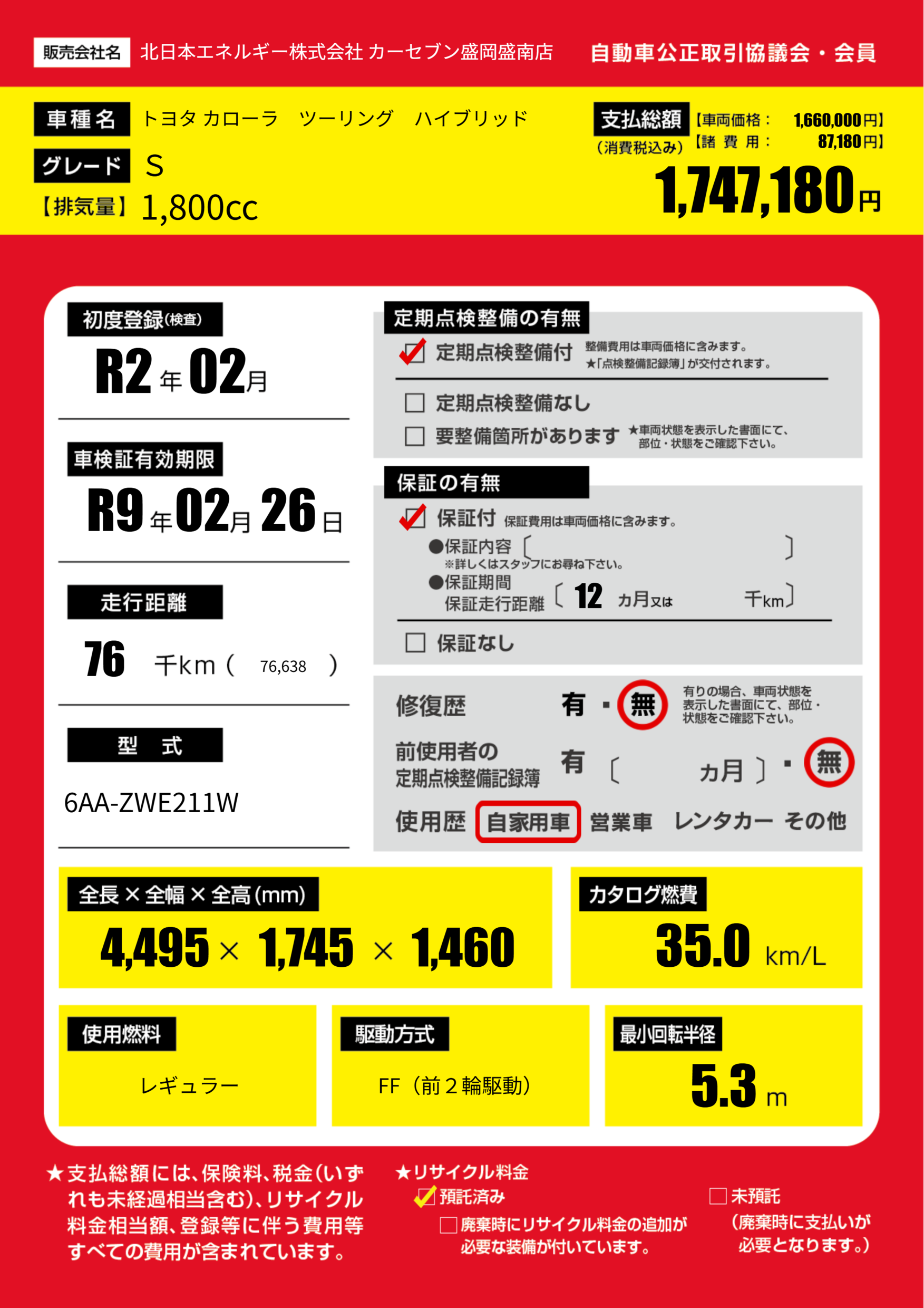 | 車名 | トヨタ カローラ ツーリング ハイブリッド | グレード ミッション 排気量 |