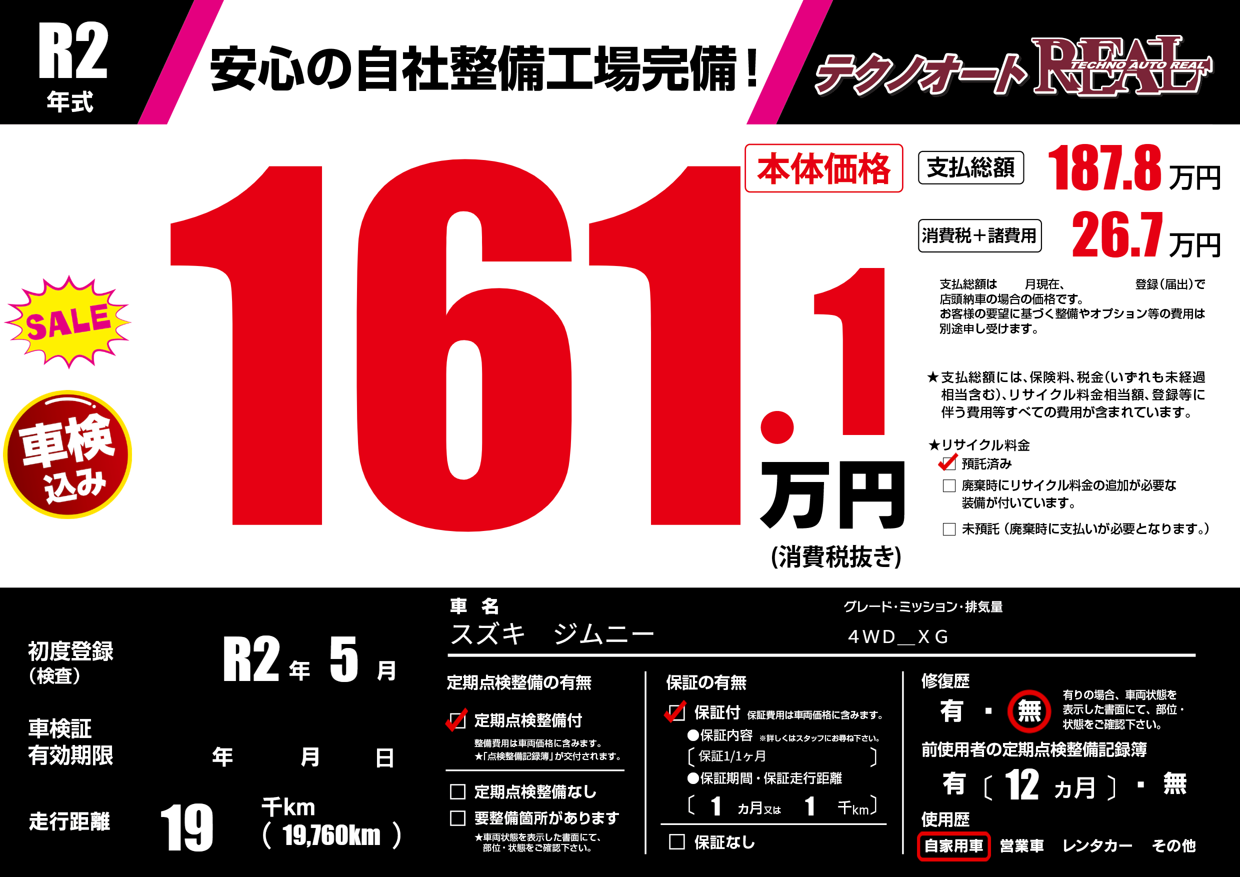 | 車名 | スズキ ジムニー | グレード ミッション 排気量 |