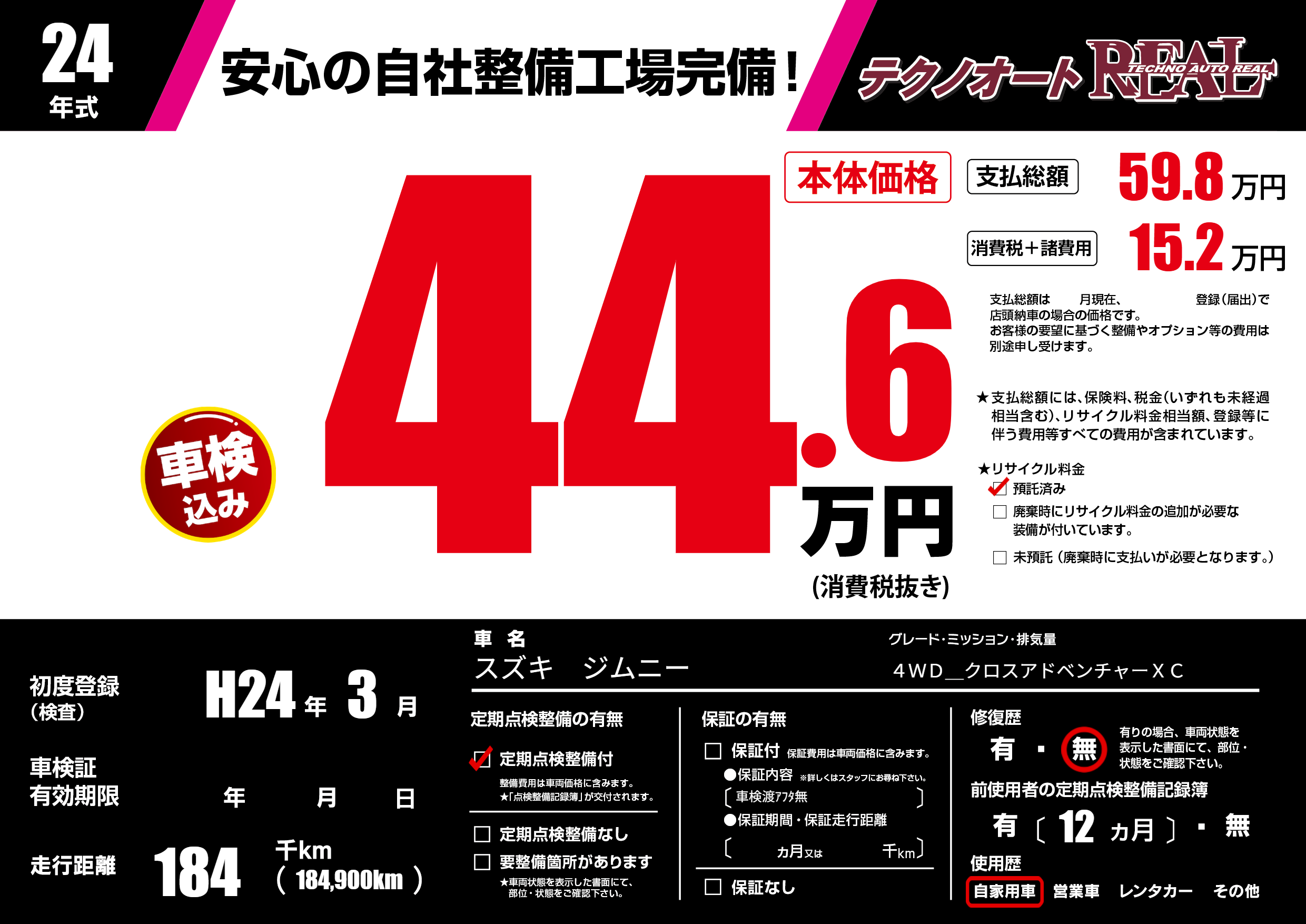 | 走行キロ | 18.4万km | 初年度登録 | H24年3月 |