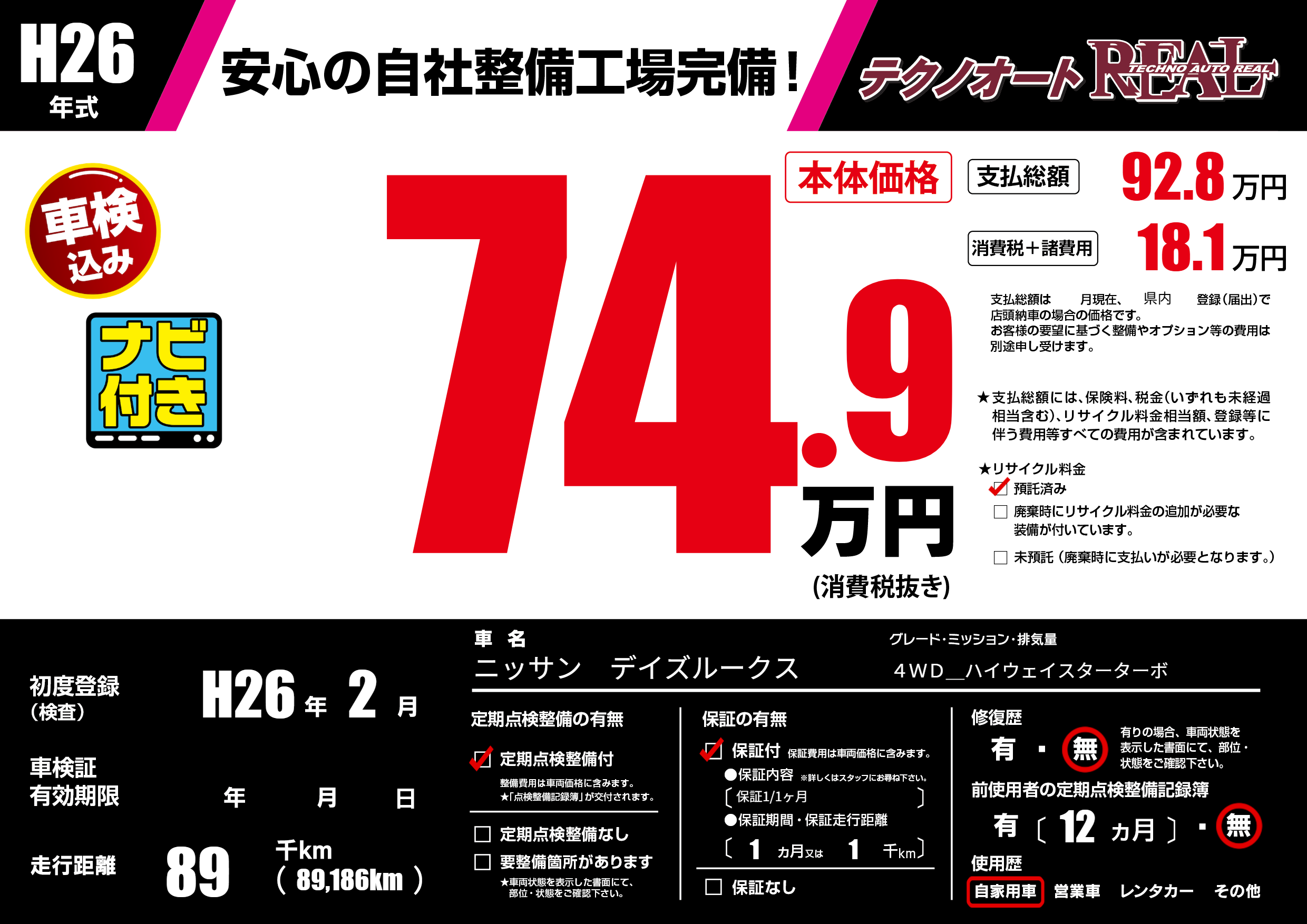 | 車名 | ニッサン デイズルークス | グレード ミッション 排気量 |