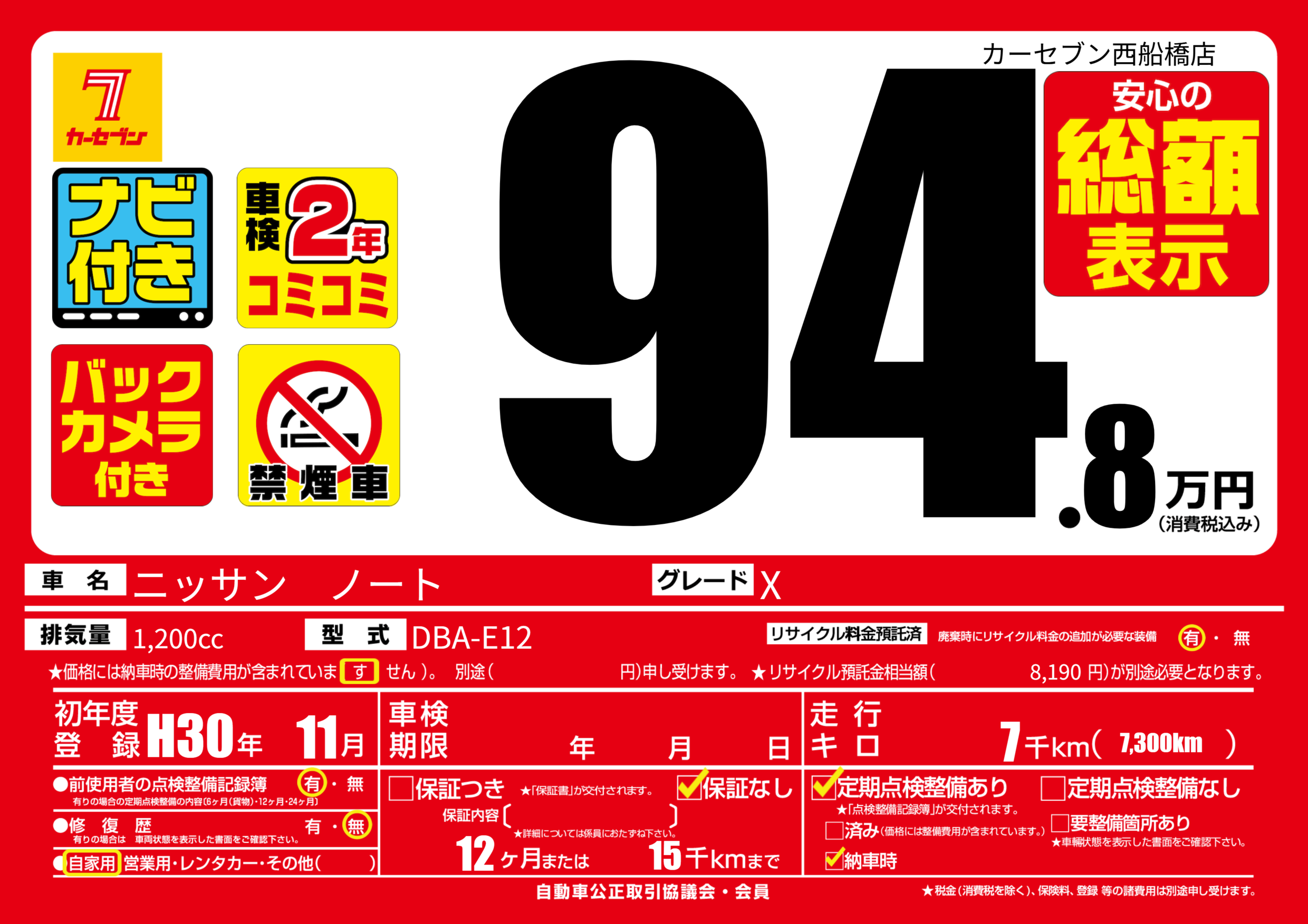| 定期点検整備 | 定期点検整備あり 納車時あり | ||