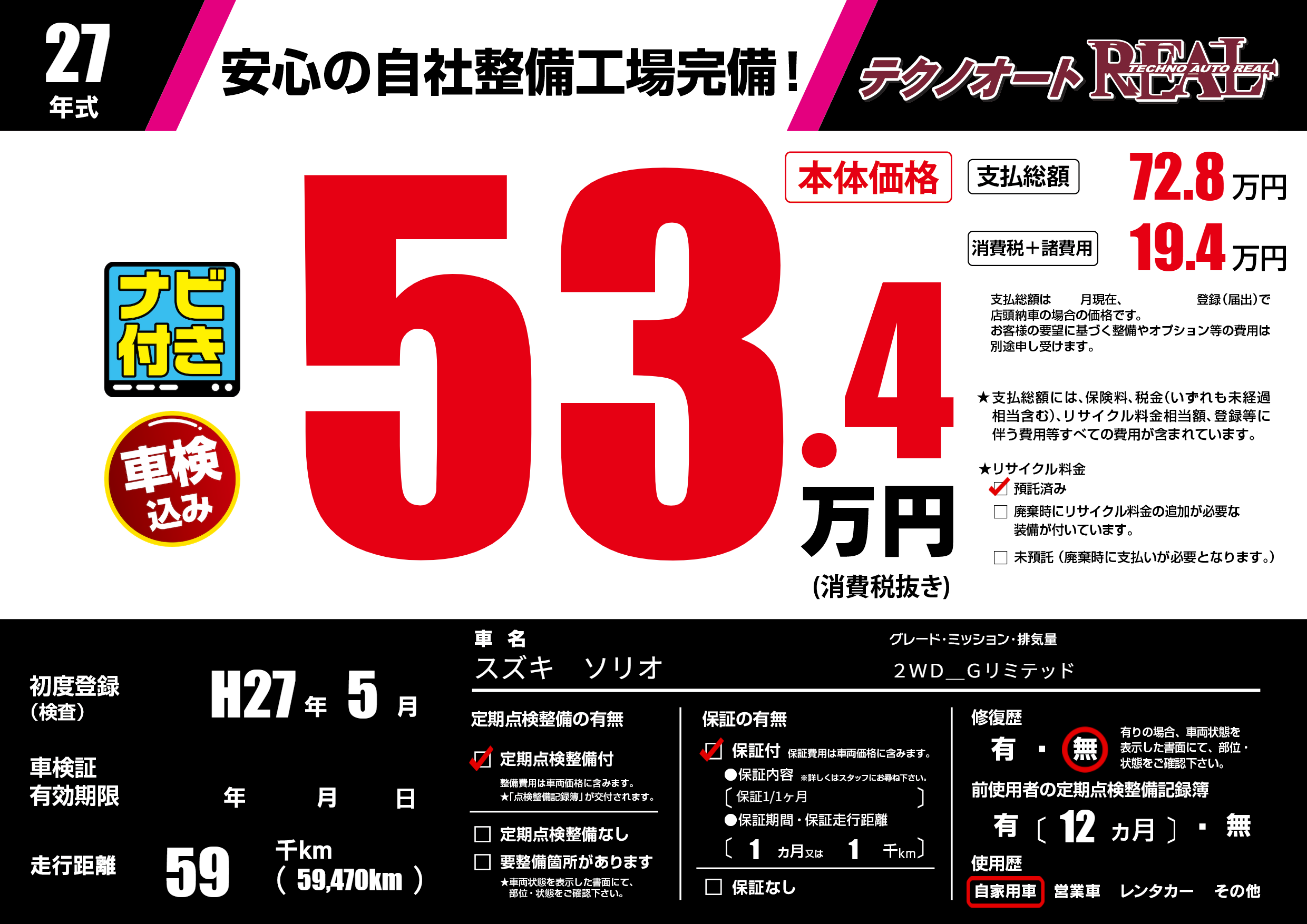 | 車名 | スズキ ソリオ | グレード ミッション 排気量 |