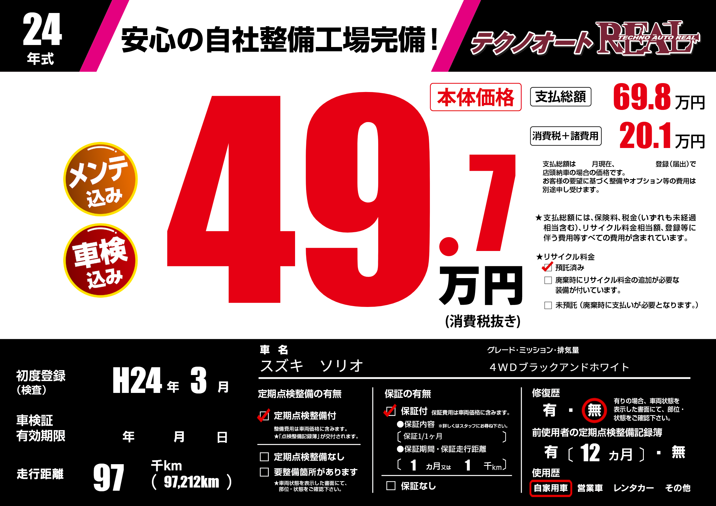 | 走行キロ | 9.7万km | 初年度登録 | H24年3月 |