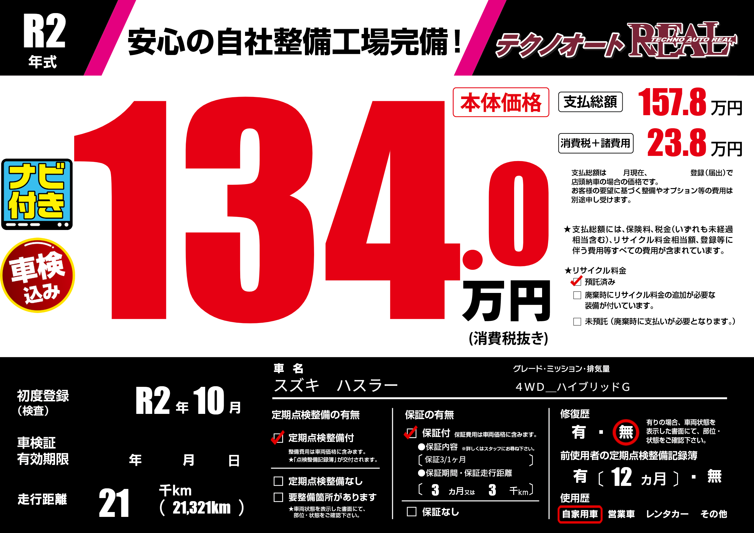 | 走行キロ | 2.1万km | 初年度登録 | R2年10月 |