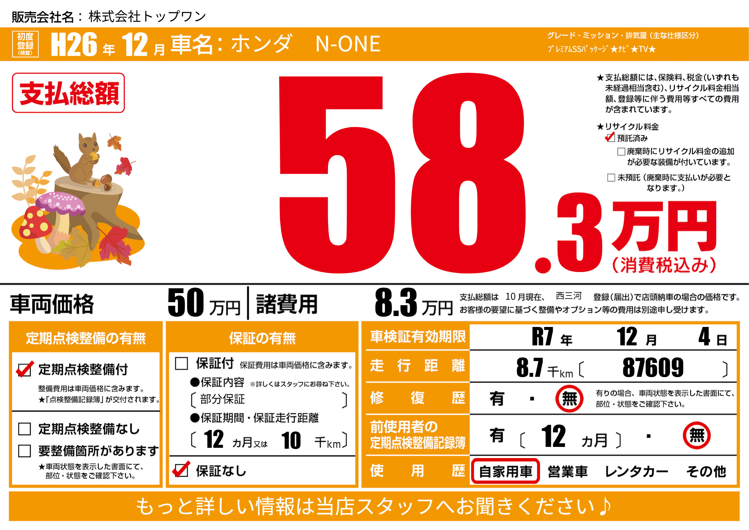 | 車名 | ホンダ N-ONE | グレード ミッション 排気量 |