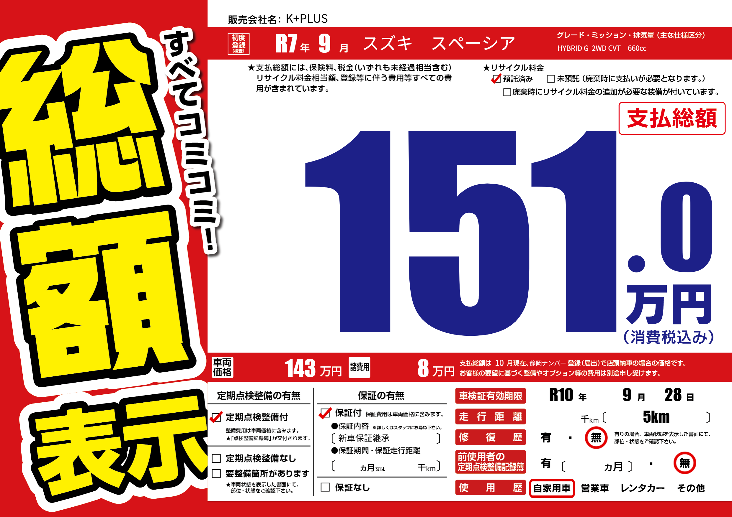 | 走行キロ | - | 初年度登録 | R7年9月 |