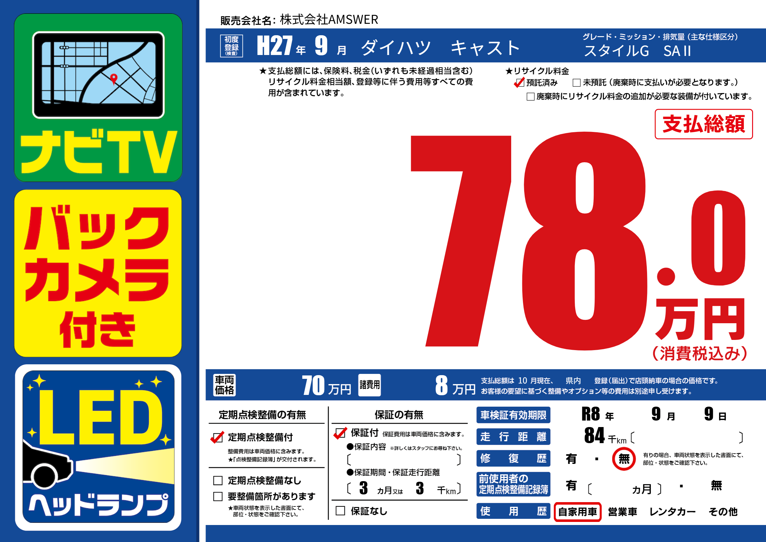 | 車名 | ダイハツ キャスト | グレード ミッション 排気量 |