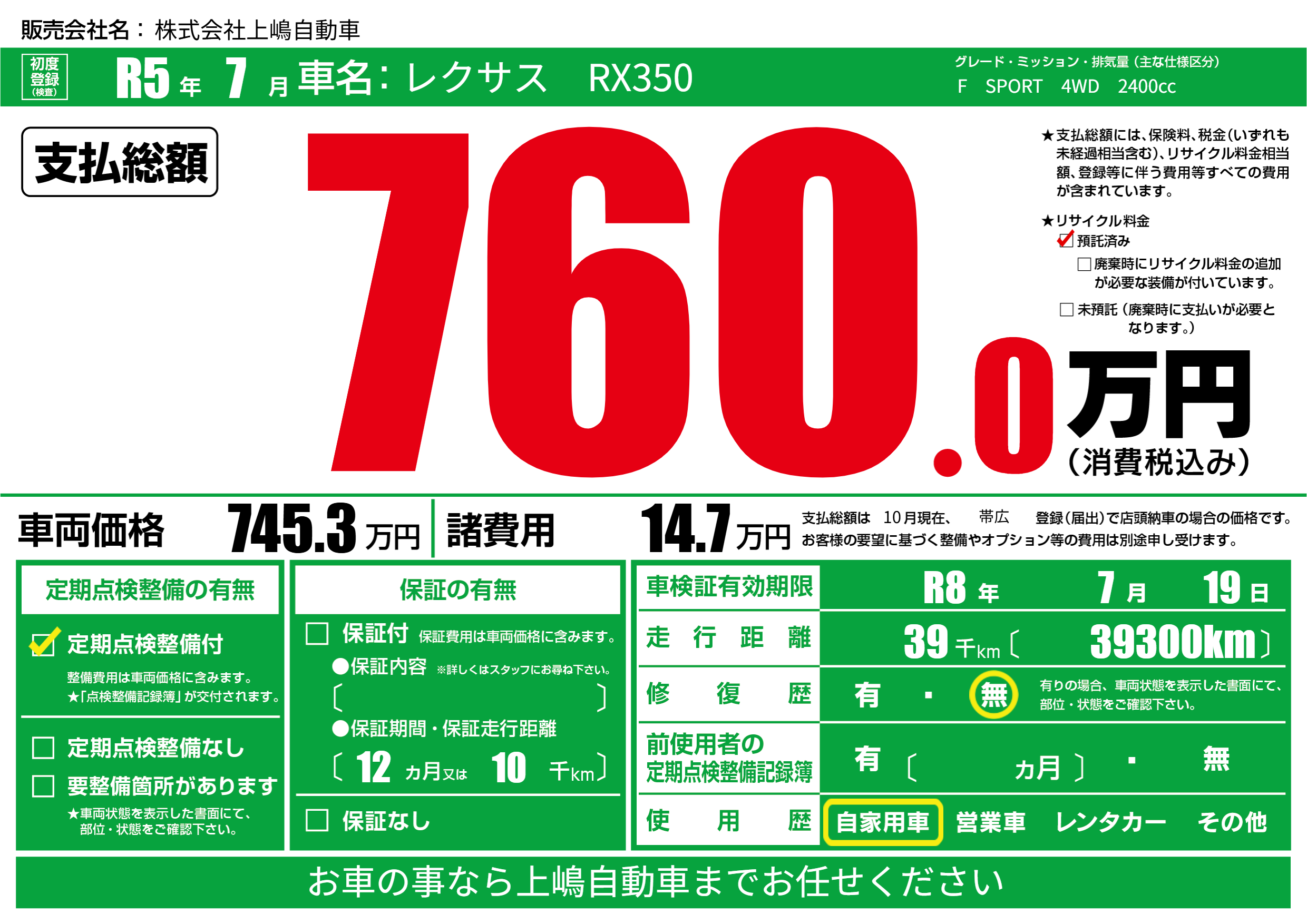 | 車名 | レクサス RX350 | グレード ミッション 排気量 |